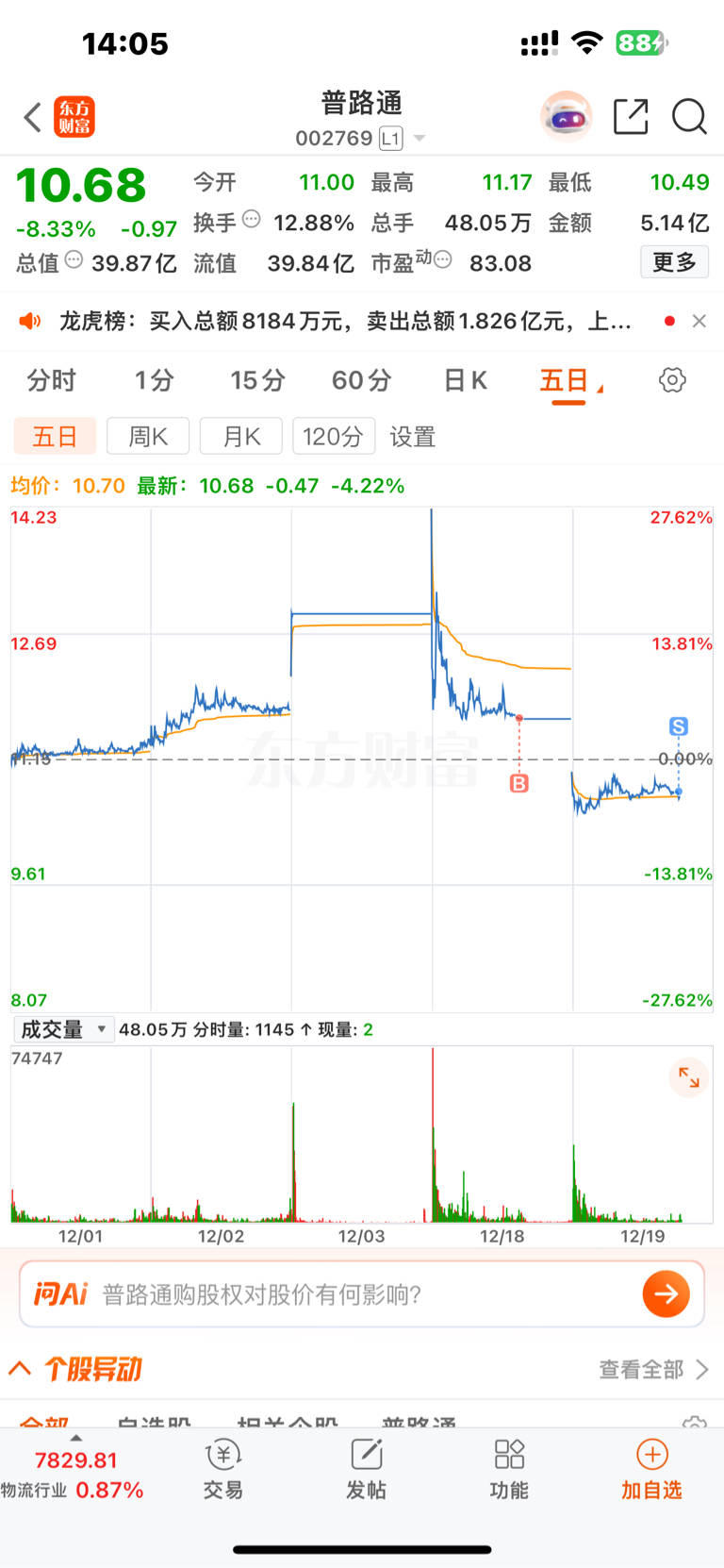 $普路通(SZ002769)$ 老子把上海九百卖了,预计博一个地天!太失败了