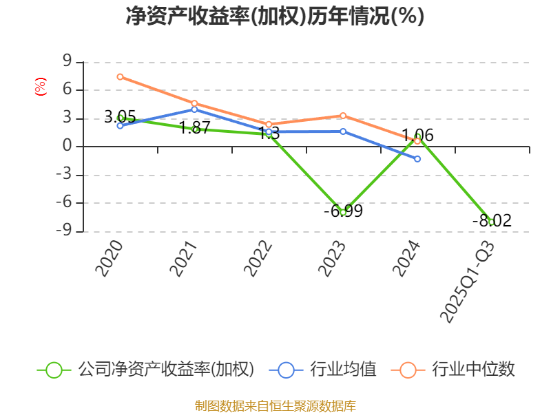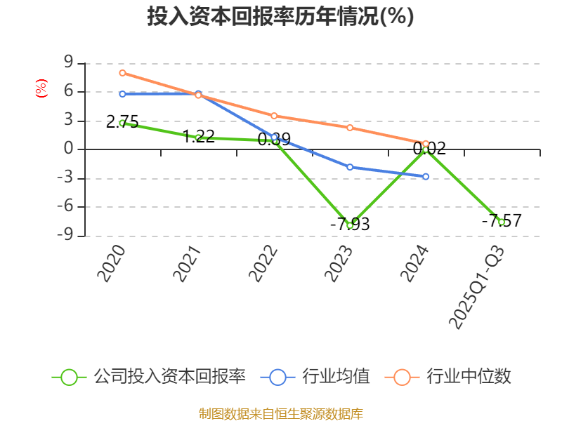 盈利能力方面, 2025年前三季度公司加权平均净资产收益率为-8.02%,同比下降4.66个百分点。公司2025年前三季度投入资本回报率为-7.57%,较上年同期下降4.34个百分点。