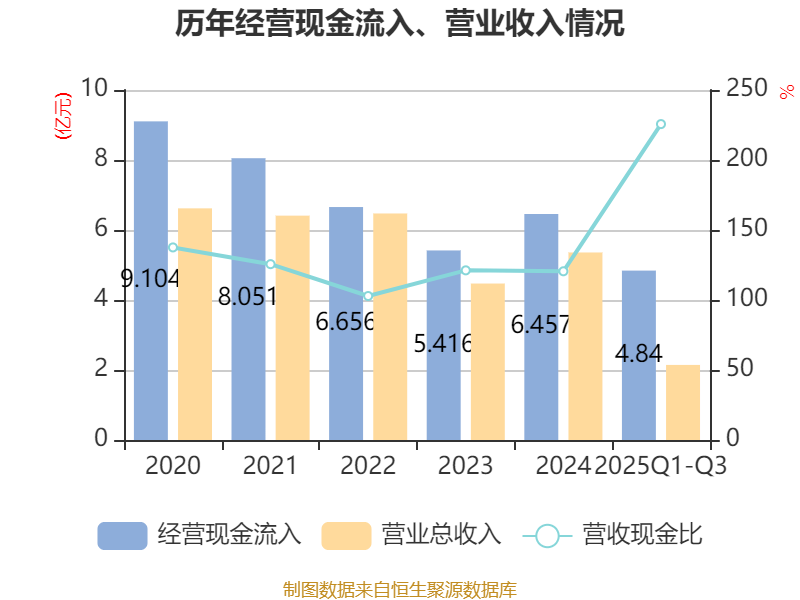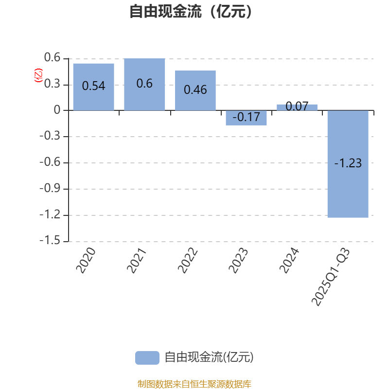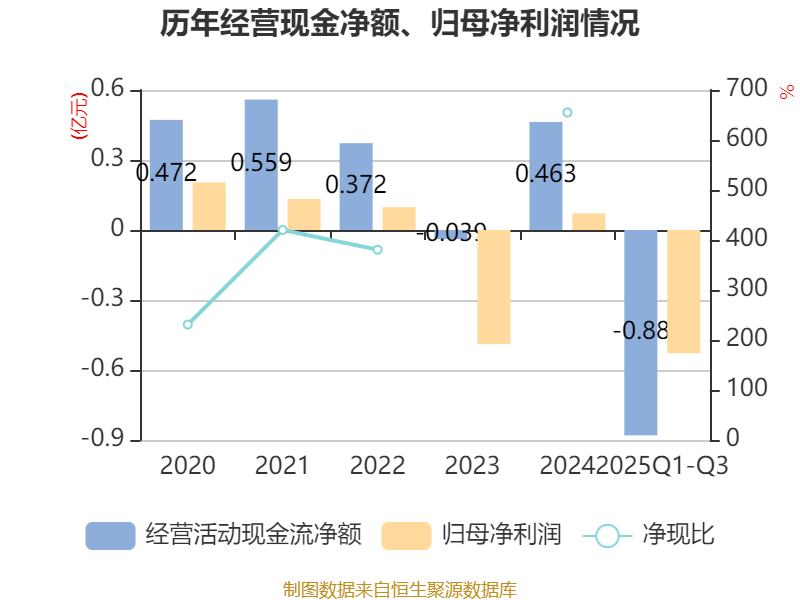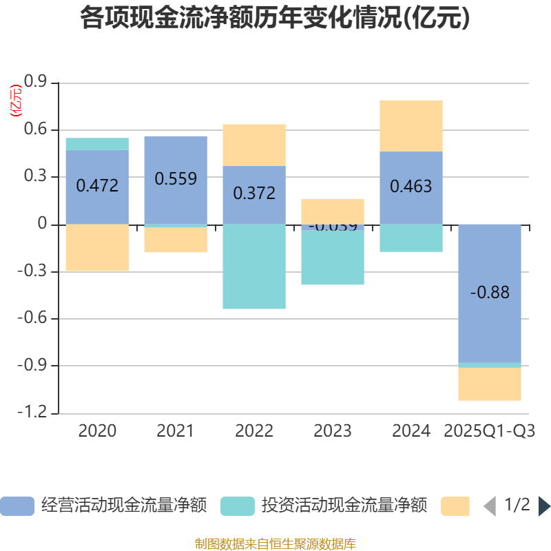2025年前三季度,公司经营活动现金流净额为-8800.83万元,同比增加480.79万元;筹资活动现金流净额-2091.89万元,同比减少6741.47万元;投资活动现金流净额-312.41万元,上年同期为-1971.6万元。