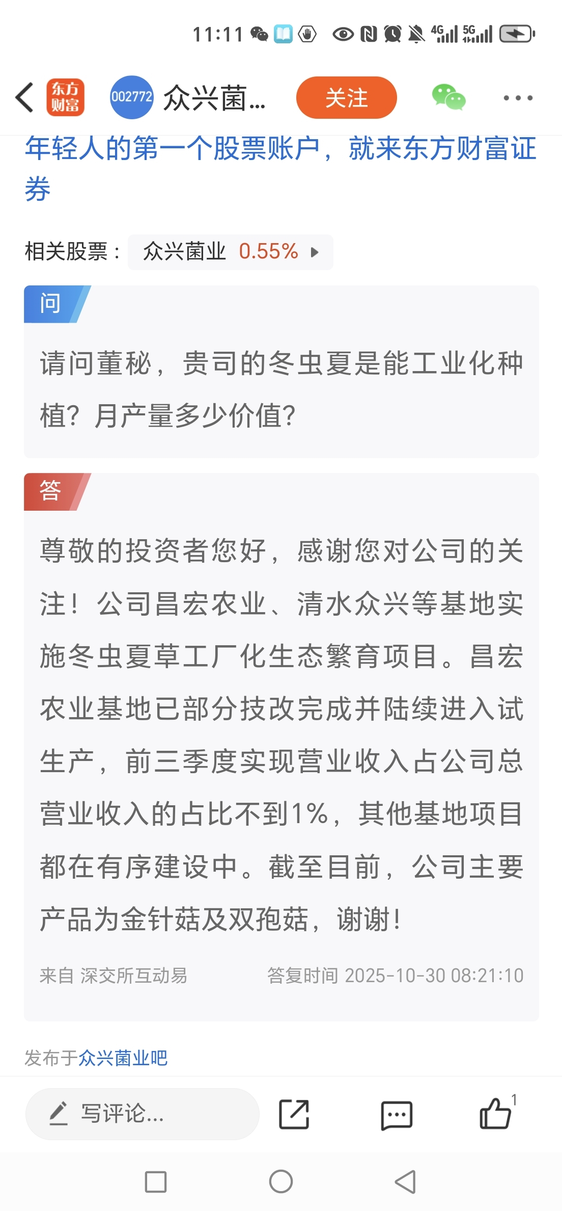 $众兴菌业(SZ002772)$ $众兴菌业(SZ002772)$ 营业收入的百分之一,前三季营业收入是14个亿,算算占多少?1400万元。