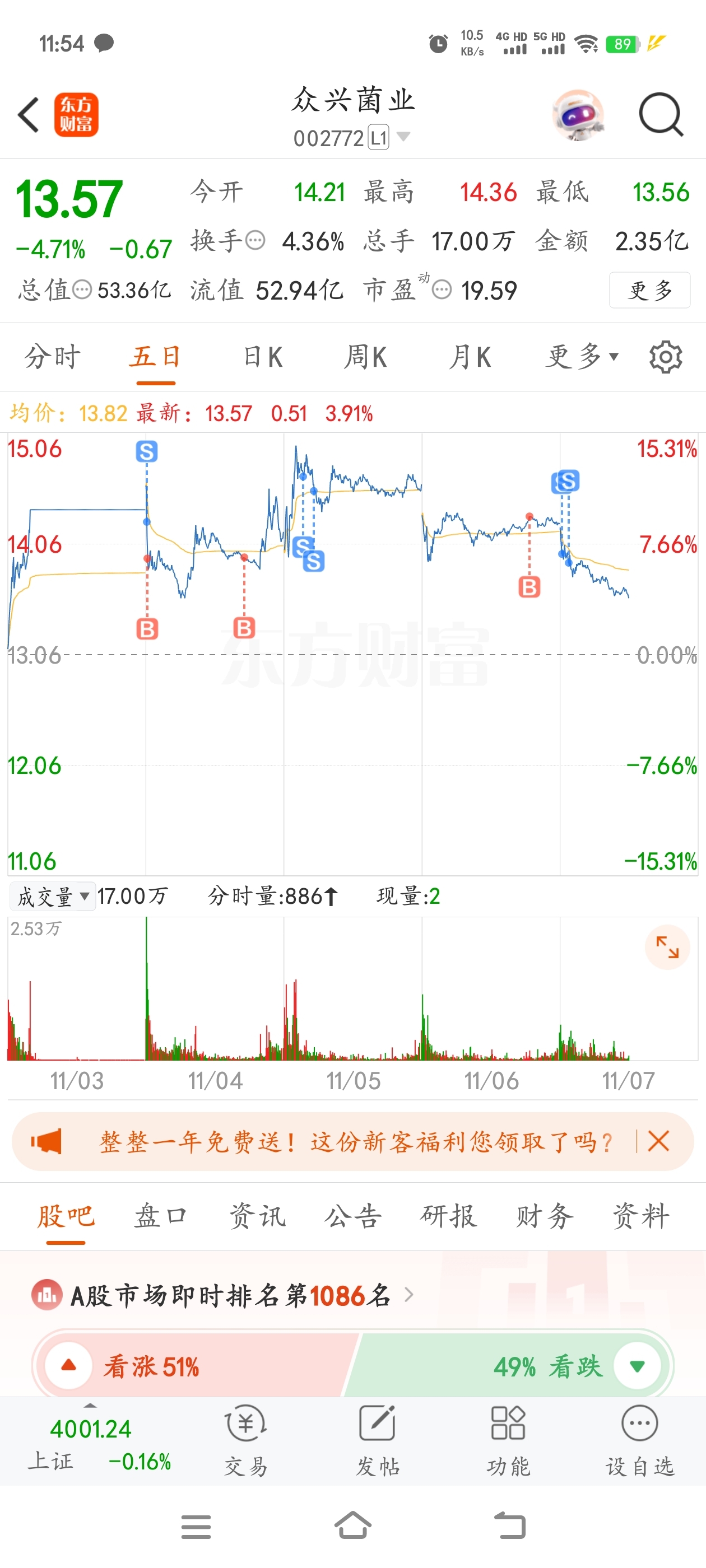 $众兴菌业(SZ002772)$ 卖完了,出去躲几天,下踩20日线在进来