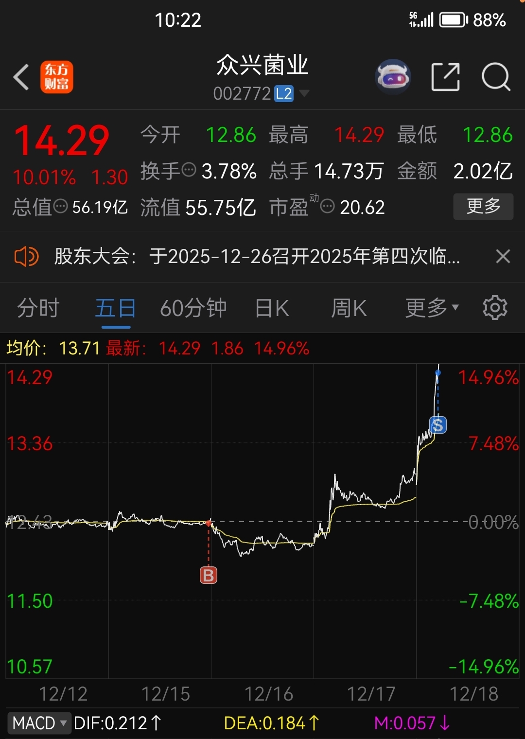 $众兴菌业(SZ002772)$ 14.19跑了,感谢主力给我抬轿