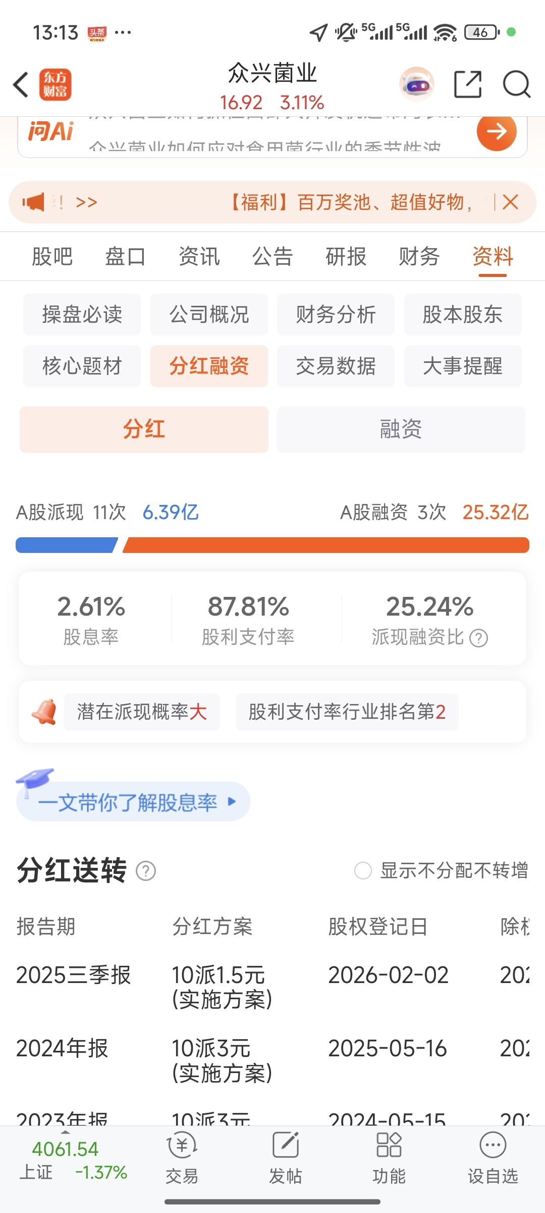 $众兴菌业(SZ002772)$ 今天进来。明天分红