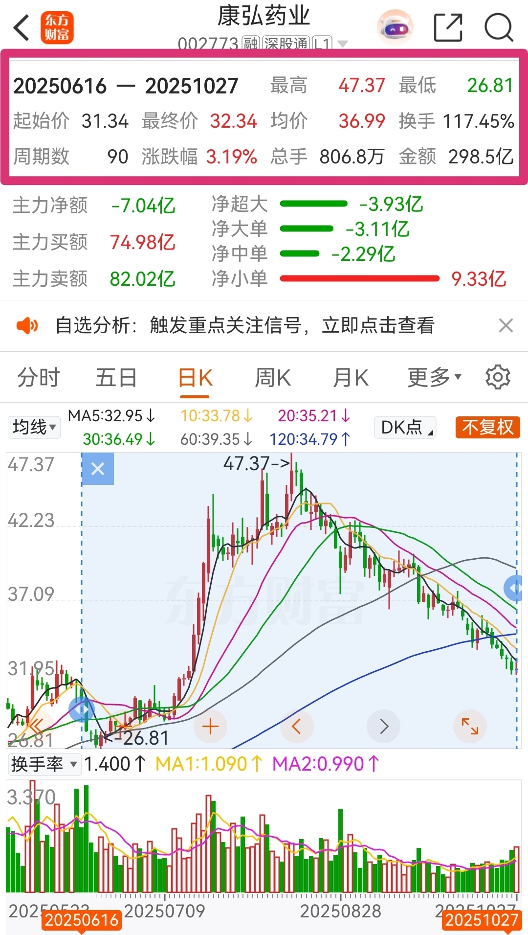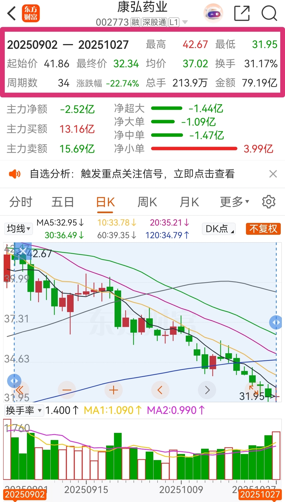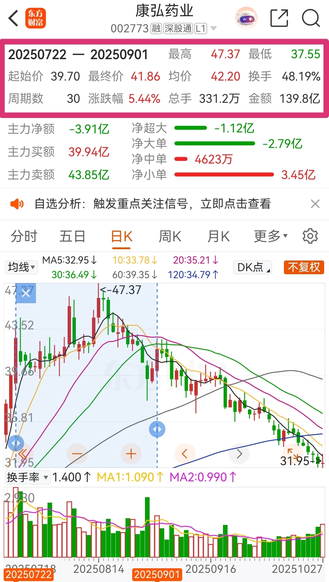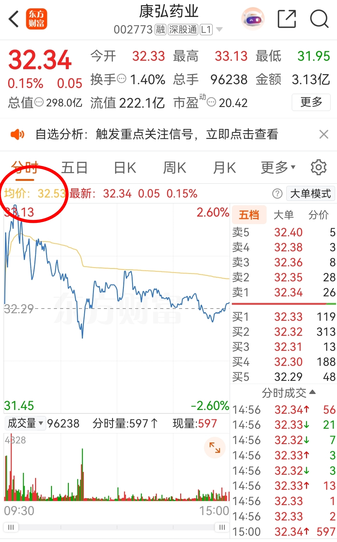 今天成交为9月2日以来的最大成交量,好事!周五今天的均价为32.49元,换手率为2.70%,三季财报如有重大变动会提前公告,业绩不会太差或过于亮丽!现在布局是炒作期待康弘的基因生物治疗新药研发的进展及预期!拭目以待!