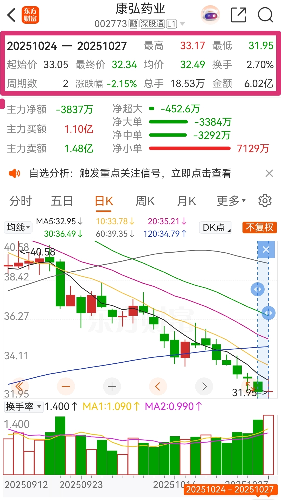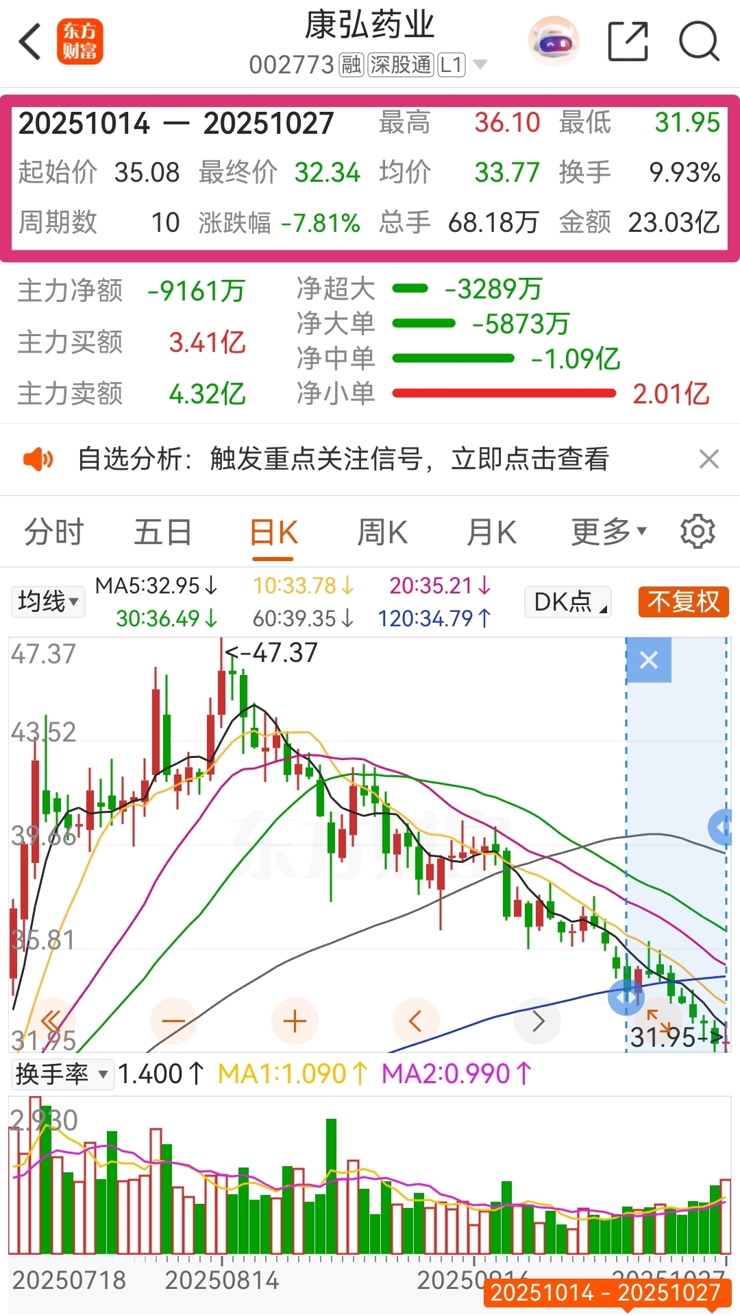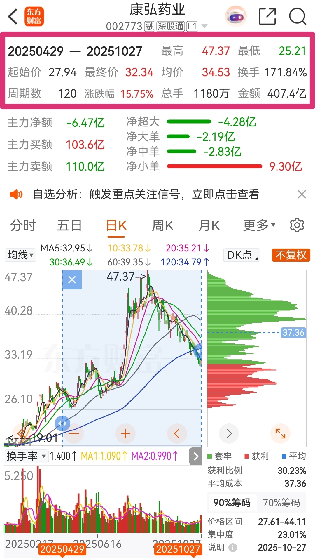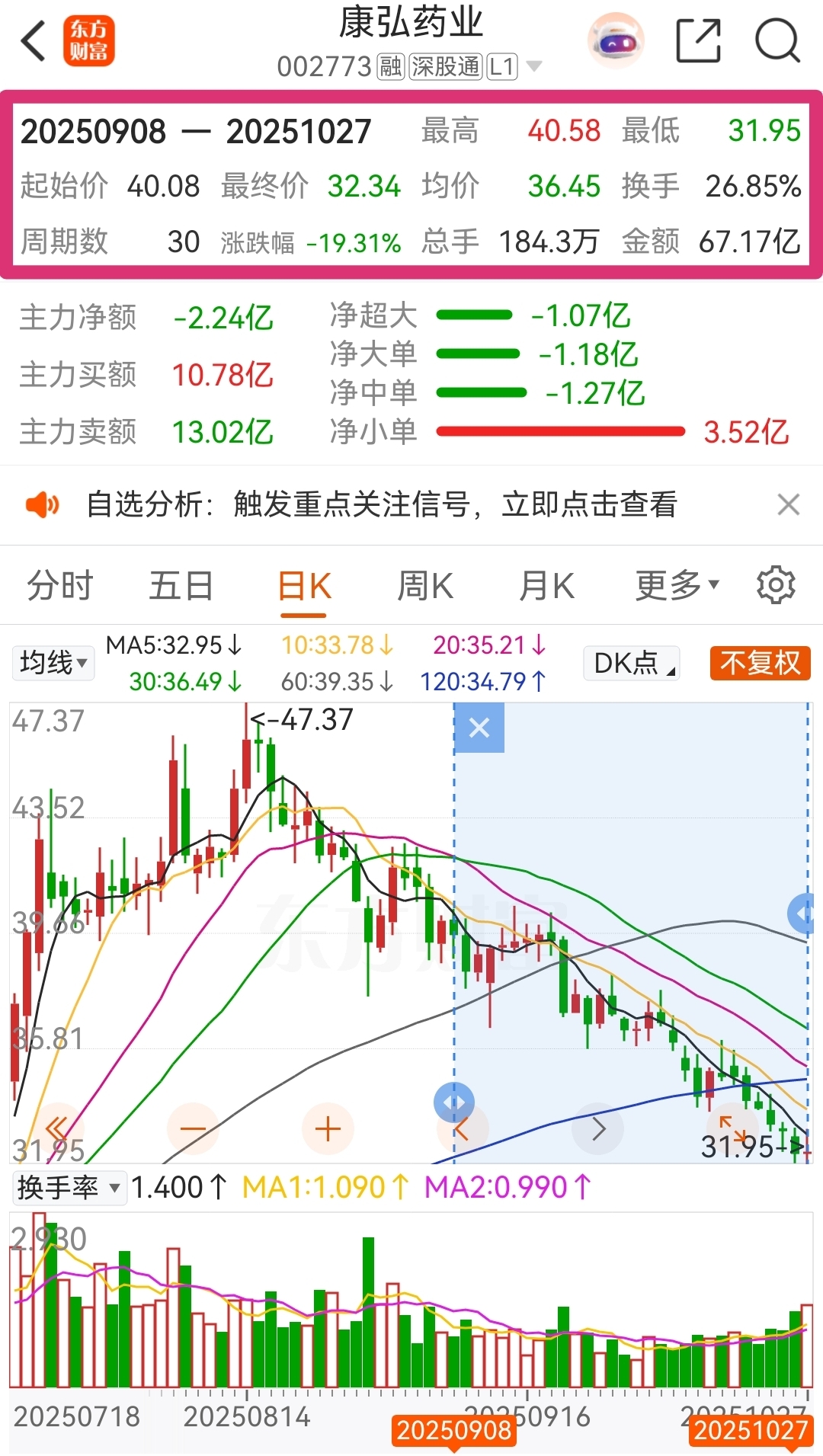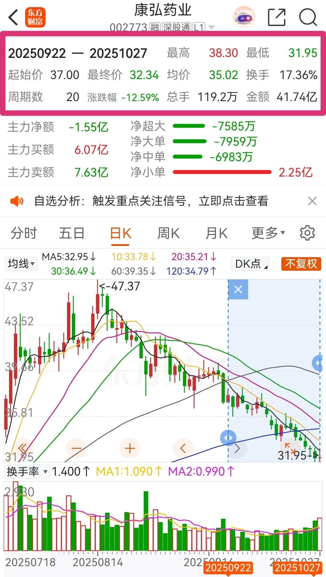 今天成交为9月2日以来的最大成交量,好事!周五今天的均价为32.49元,换手率为2.70%,三季财报如有重大变动会提前公告,业绩不会太差或过于亮丽!现在布局是炒作期待康弘的基因生物治疗新药研发的进展及预期!拭目以待!