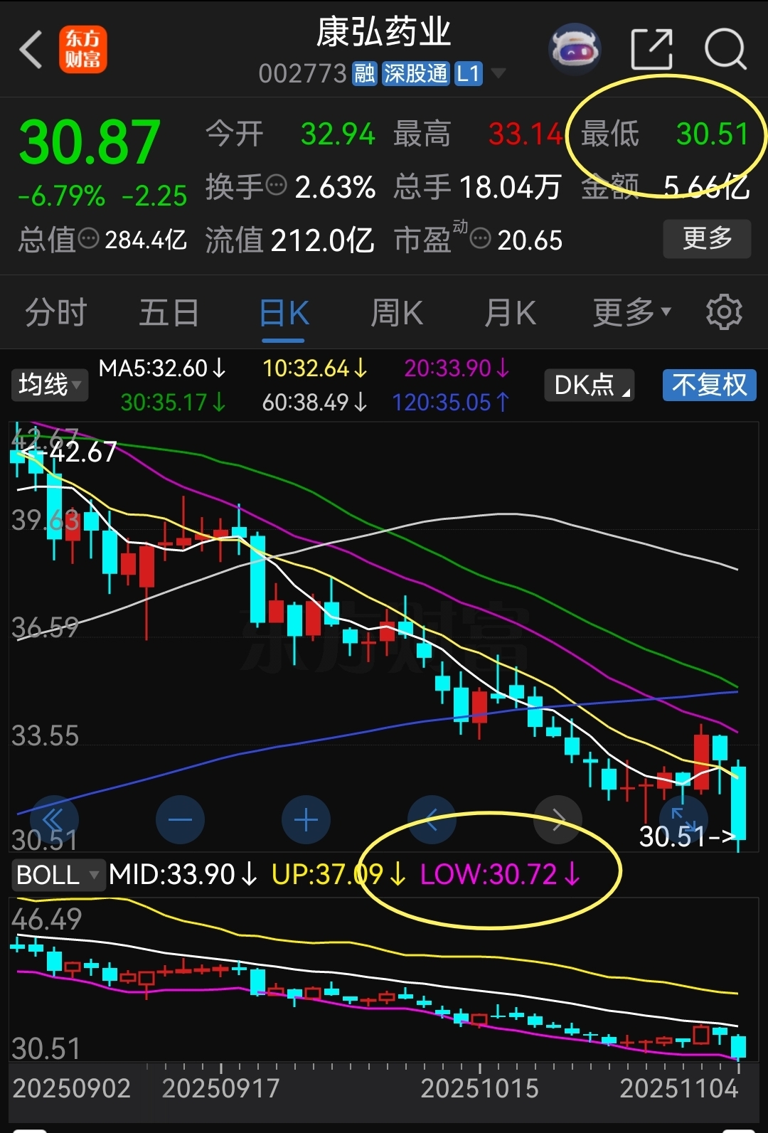 康弘今天最低价30.51元击穿BOLL线下轨,收盘价30.87元站在BOLL线下