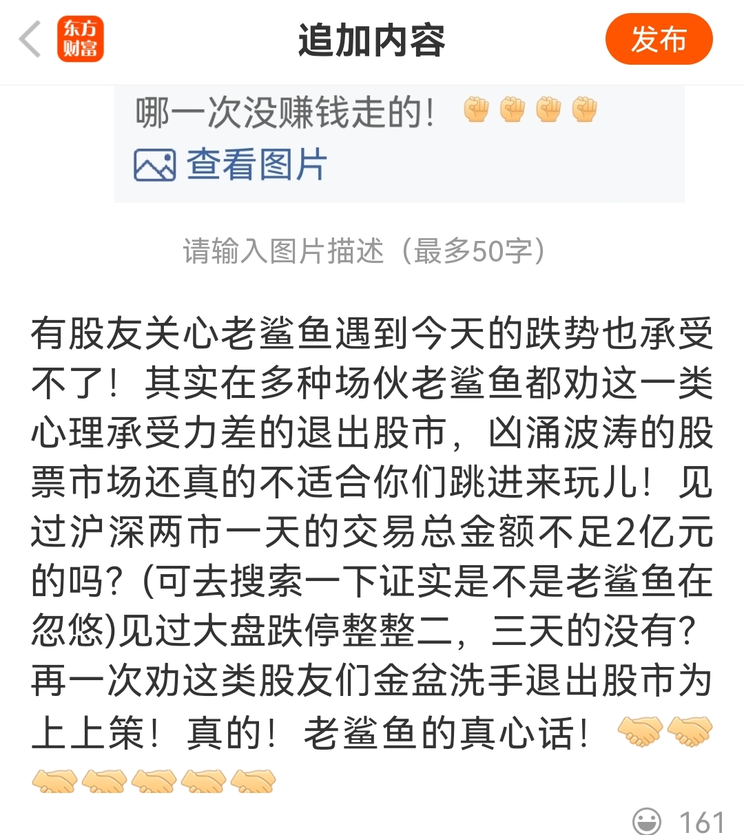温馨提示: 1.根据《证券法》规定,禁止编造、传播虚假信息或者误导性信息,扰乱证券市场;2.用户在本社区发表的所有资料、言论等仅代表个人观点,与本网站立场无关,不对您构成任何投资建议。用户应基于自己的独立判断,自行决定证券投资并承担相应风险。《东方财富社区管理规定》