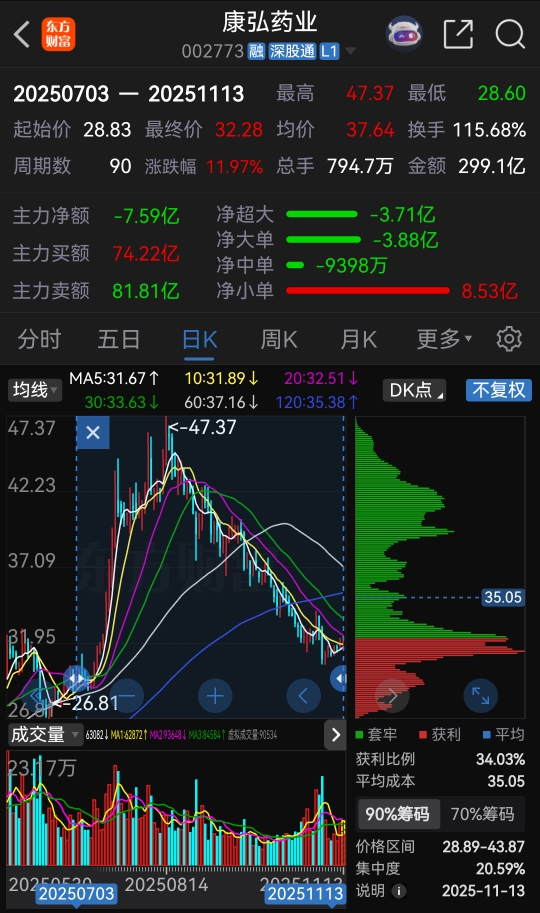 当前的强压力位在90天区间交易的平均价37.64元区域!成交量换手为115.68%!切记别参与追涨杀跌!