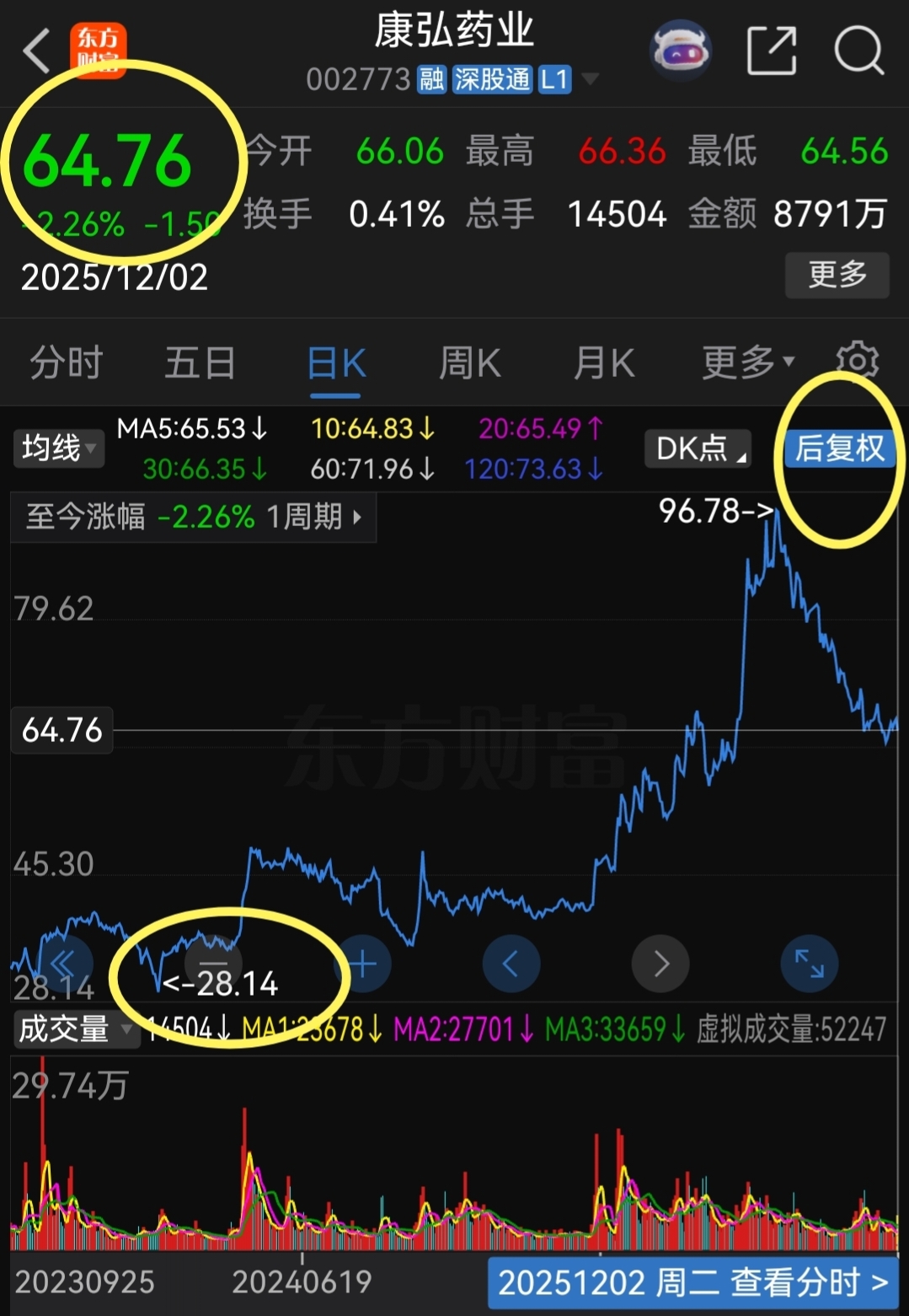 $康弘药业(SZ002773)$ 此时康弘复满权(后复权)股价!