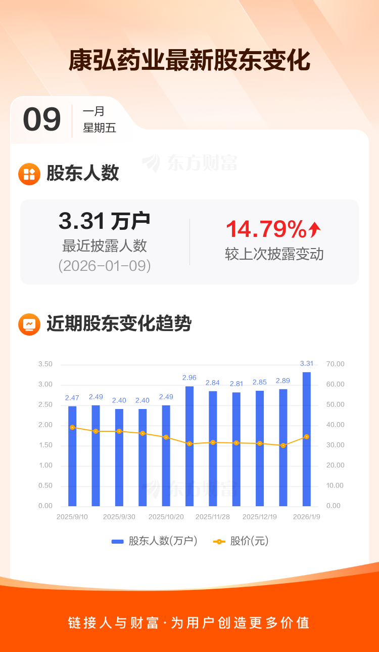 康弘药业:截至1月9日最新股东户数3.31万户,较上期增加14.79%