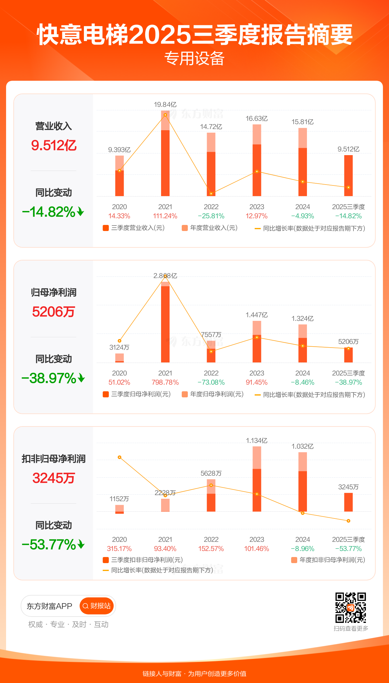 快意电梯10月31日发布2025年三季报显示,公司前三季实现营业收入9.51亿元,同比下滑14.82%;归母净利润5206.16万元,同比下滑38.97%;扣非归母净利润3244.82万元,同比下滑53.77%。