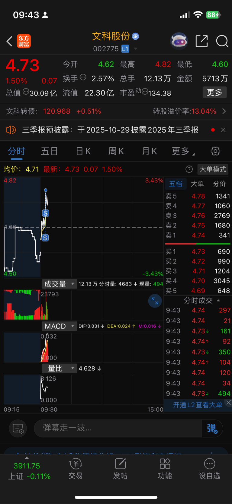 $文科股份(SZ002775)$  4.82元赚钱卖了一半仓位,今天准备清仓