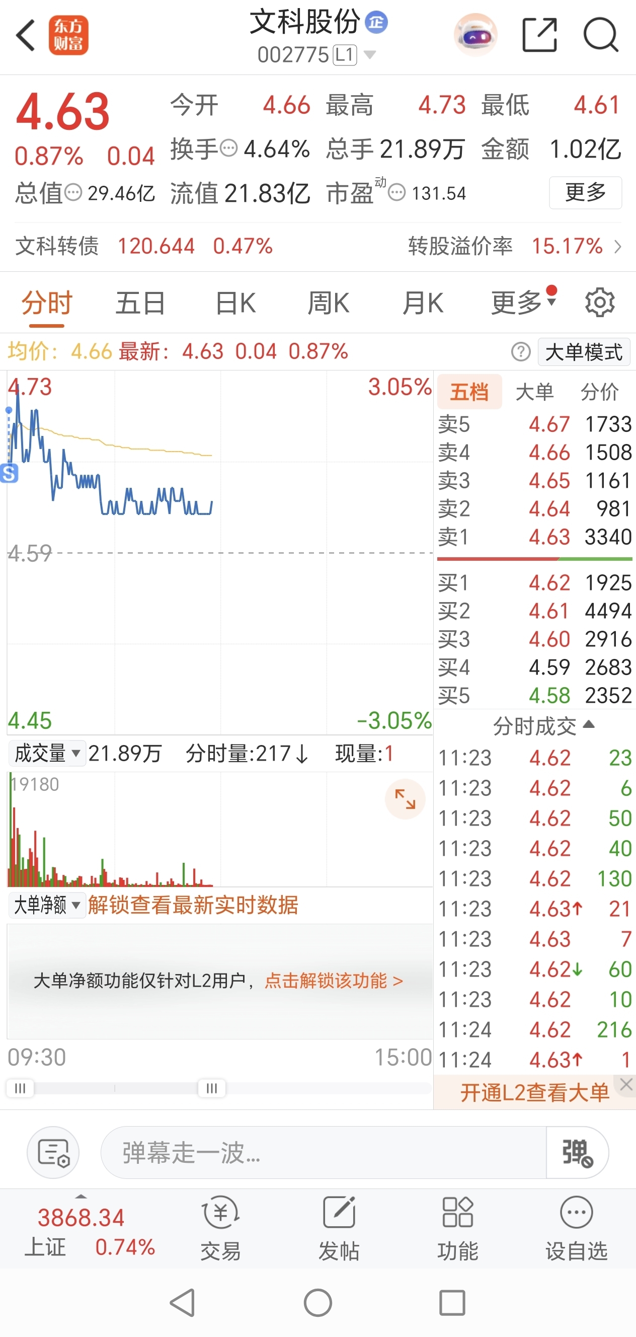 $文科股份(SZ002775)$ 下午涨停,别急,因为我一开盘就卖了。