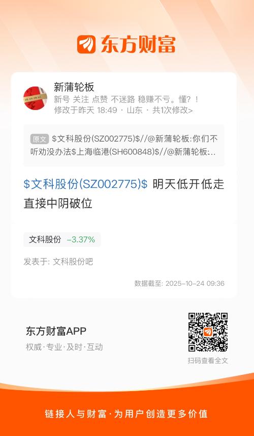 $文科股份(SZ002775)$ 明天低开低走 直接中阴破位