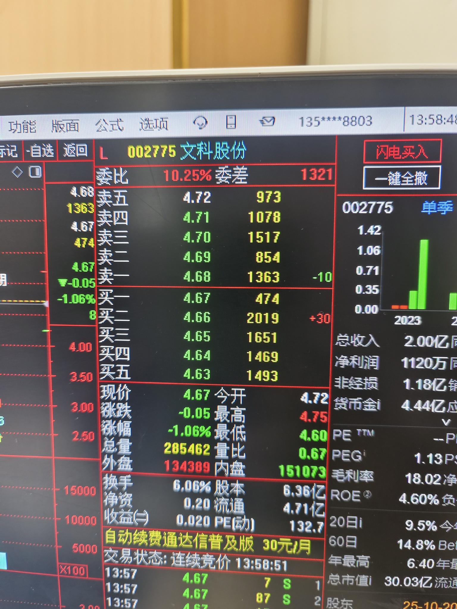 $文科股份(SZ002775)$ 托单,买盘卡单,今天估计三个点跌幅