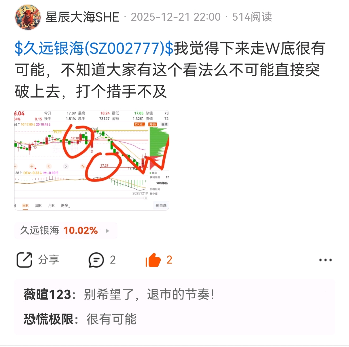 $久远银海(SZ002777)$ 大家还记得我说的吗,W底然后让你来个措手不及