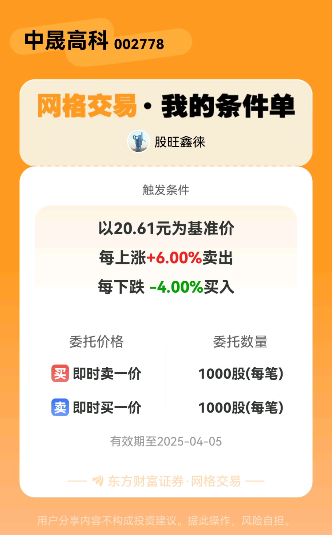 #条件单交流# #网格交易晒单# 一位股神设置了一个网格交易条件单,接下来就是见证奇迹的时刻~$中晟高科(SZ002778)$