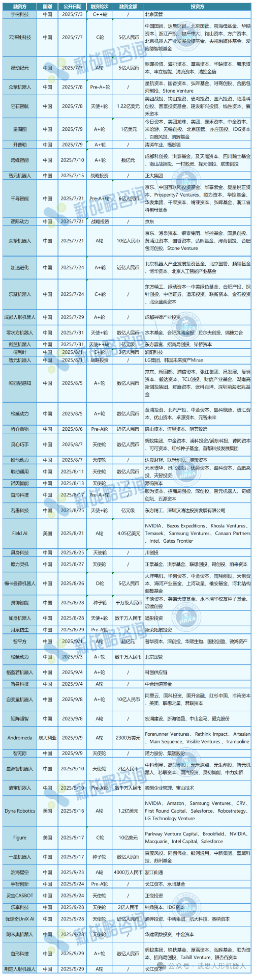 人形机器人场景应用联盟监测显示,2025年第三季度全球公开的股权融资事件超过56