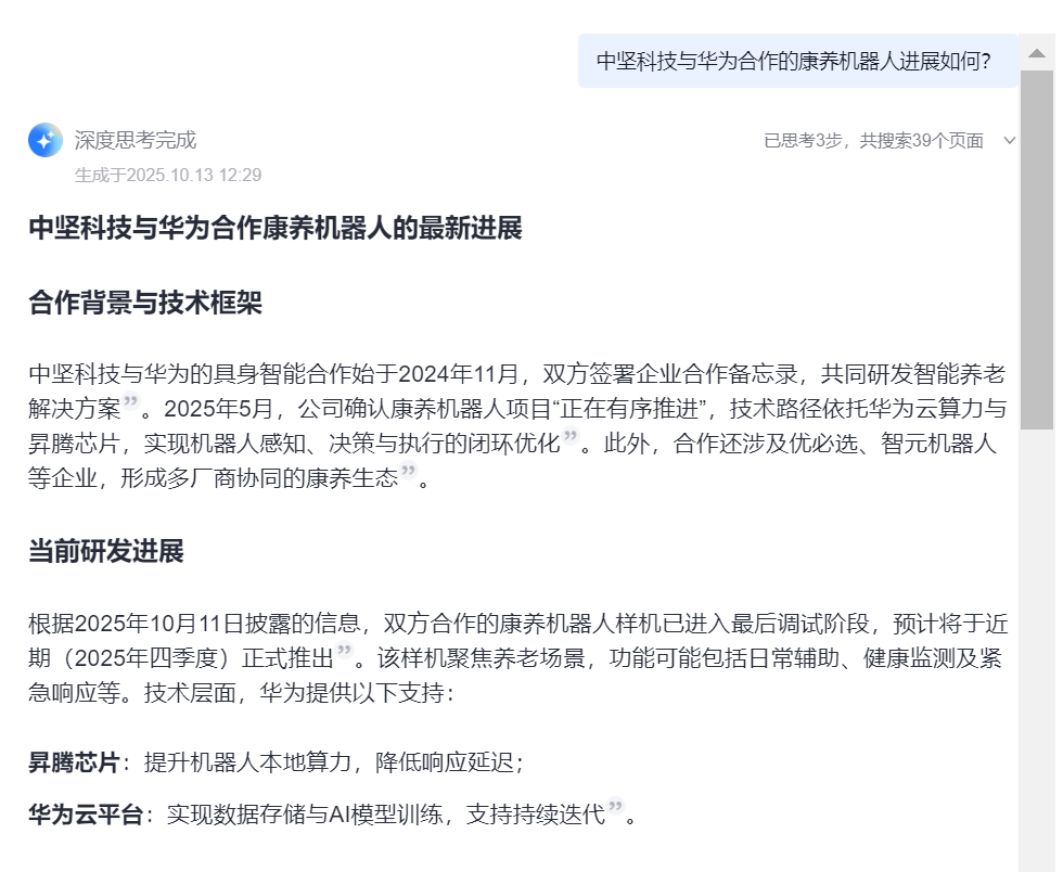 AI说中坚科技与HW合作的康养机器人已进入调试阶段,预计四季度推出?