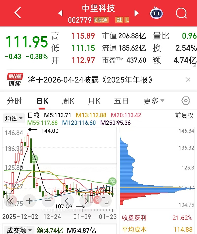 说回中坚,从筹码分布上看,当前筹码呈单峰密集形态,核心筹码集中于114.88元附近,收盘价111.95元略低于平均成本,短期浮筹占比低,而前期136-146元的高位筹码峰已大幅缩减、近乎消失。