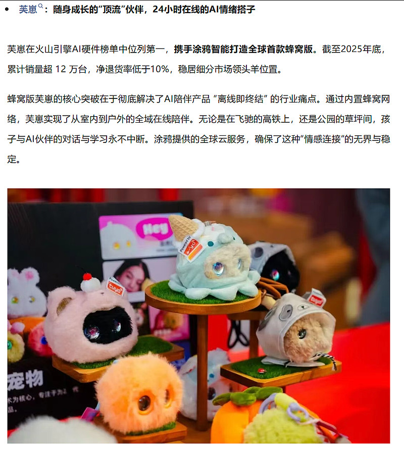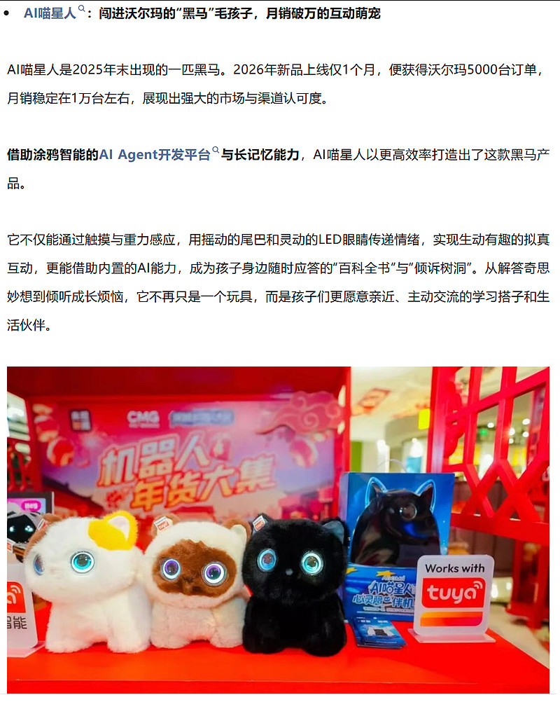 这些丰富多样、情感细腻的AI创意如何快速落地并成为爆款?对此涂鸦是这么说的:关键在于公司提供了一站式“交钥匙”的解决方案,涂鸦的AI Agent开发平台与TuyaOpen开源框架,将复杂的AI能力、全球云连接和生态服务封装成标准化模块,极大降低AI的开发门槛。开发者得以从底层技术攻坚中解放,将全部精力转向场景深挖与体验打磨——如何让交互更温暖,如何让陪伴更贴心。