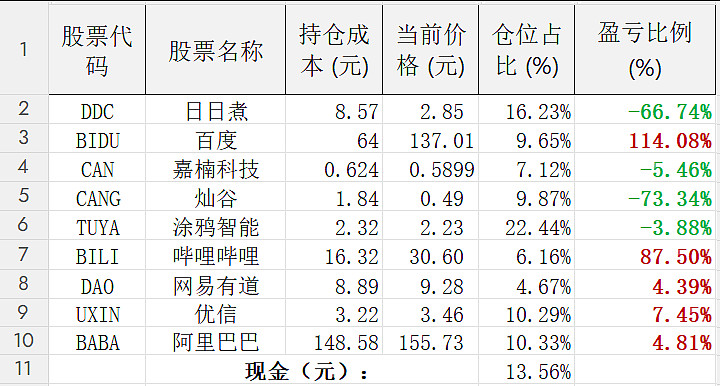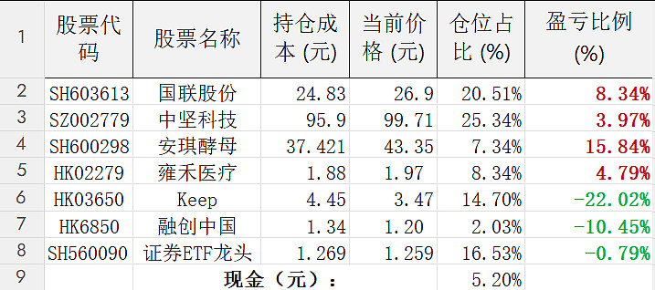 当前仓位分布表: