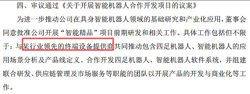 2026年1月4日:中坚科技发布公告,审议通过《关于开展智能机器人合作开发项目的议案》,明确提出将与行业领先终端设备提供商(结合双方前期深度合作背景,该提供商即为华为)全方位推进机器人相关业务合作。公告明确双方将共同推动四足机器人、智能机器人的应用场景分析及产品线定义,合作开发相关软件系统,并组建涵盖研发、供应链管理、市场服务等职能的联合团队,推进产品开发与商业化落地,标志着双方合作正式升级为全方位机器人开发协同,覆盖技术研发、产品定义、供应链、市场全链条。