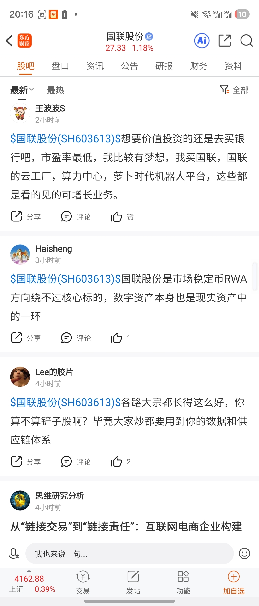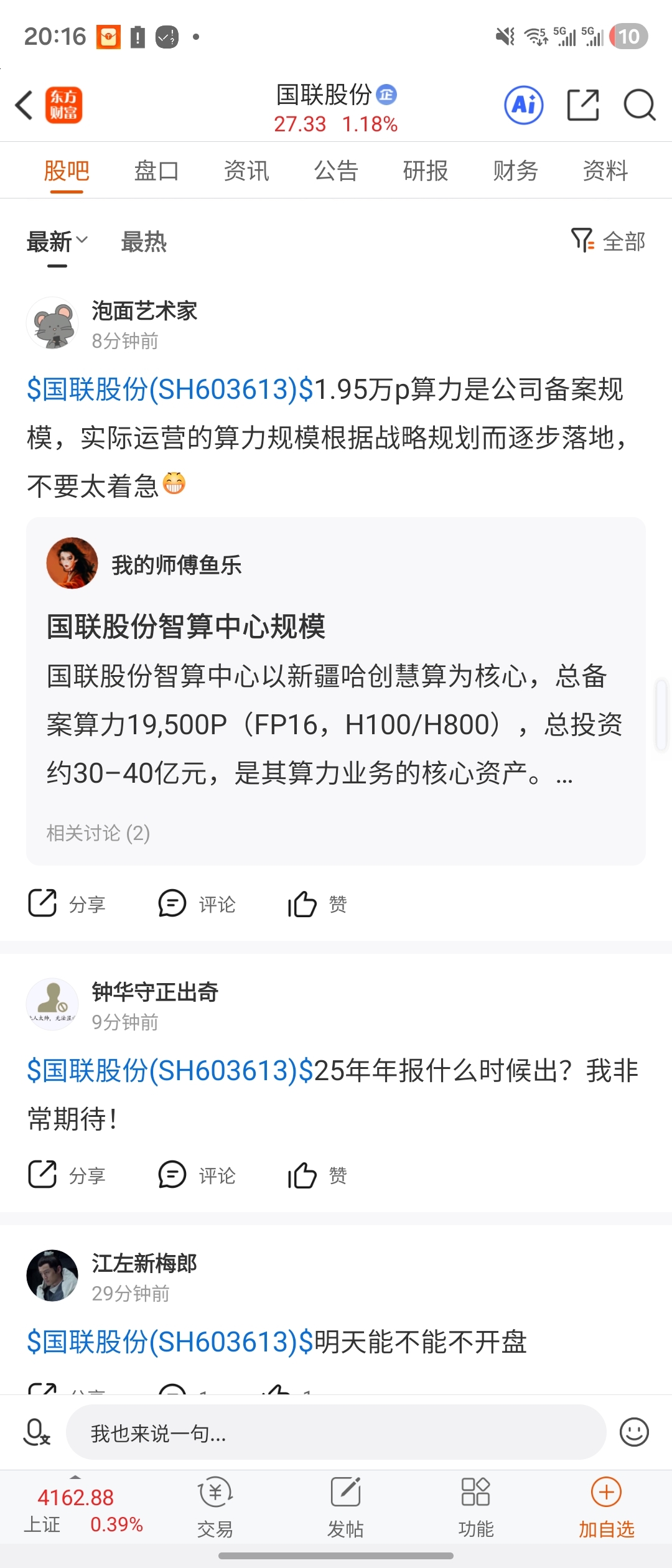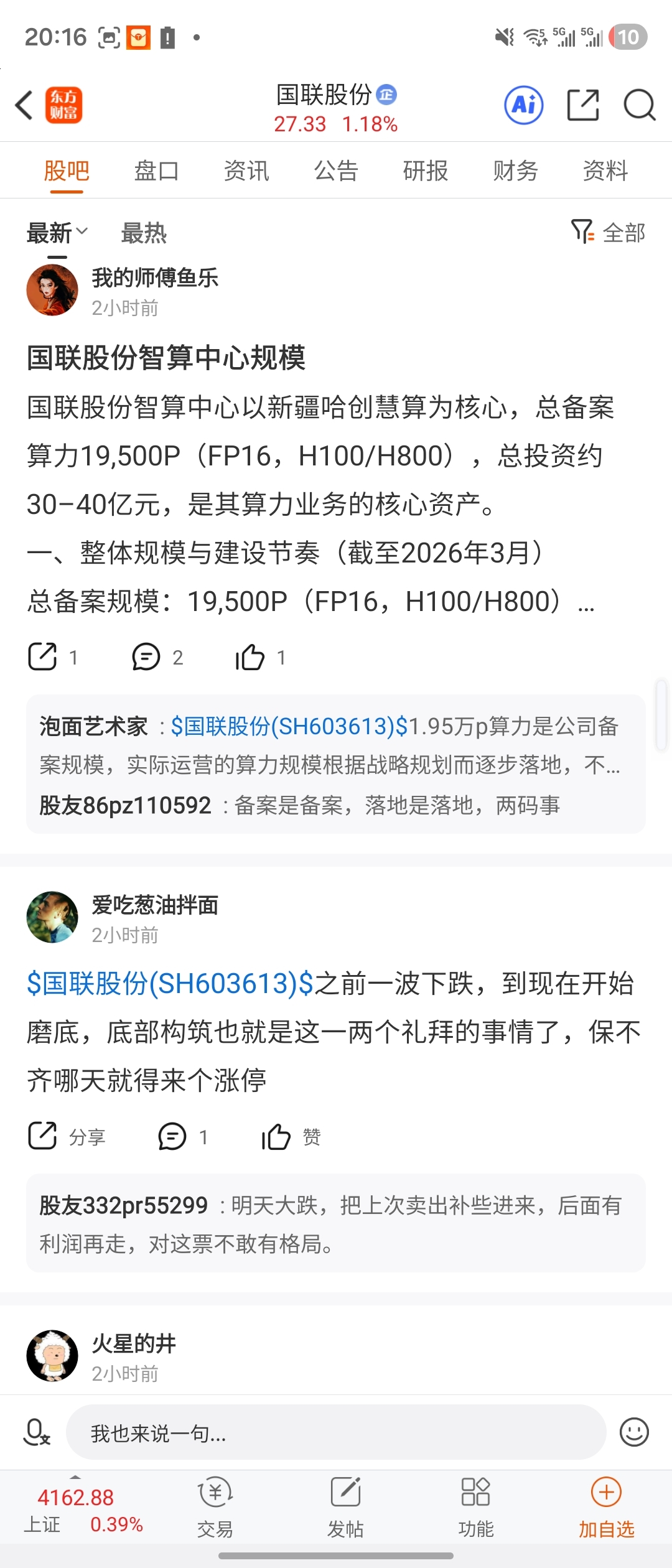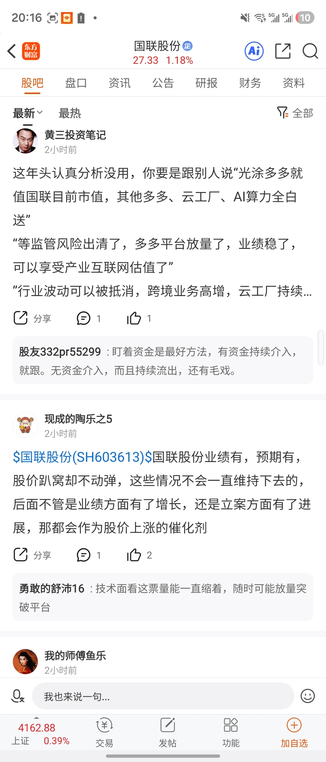 温馨提示: 1.根据《证券法》规定,禁止编造、传播虚假信息或者误导性信息,扰乱证券市场;2.用户在本社区发表的所有资料、言论等仅代表个人观点,与本网站立场无关,不对您构成任何投资建议。用户应基于自己的独立判断,自行决定证券投资并承担相应风险。《东方财富社区管理规定》