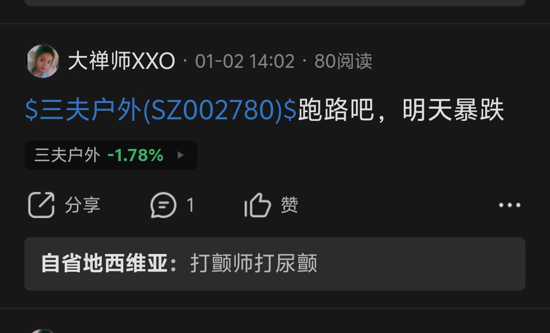 $三夫户外(SZ002780)$ 1月2号大涨5个点,本大师已经叫你们跑了,1月3号暴跌6个多点,不听劝啊