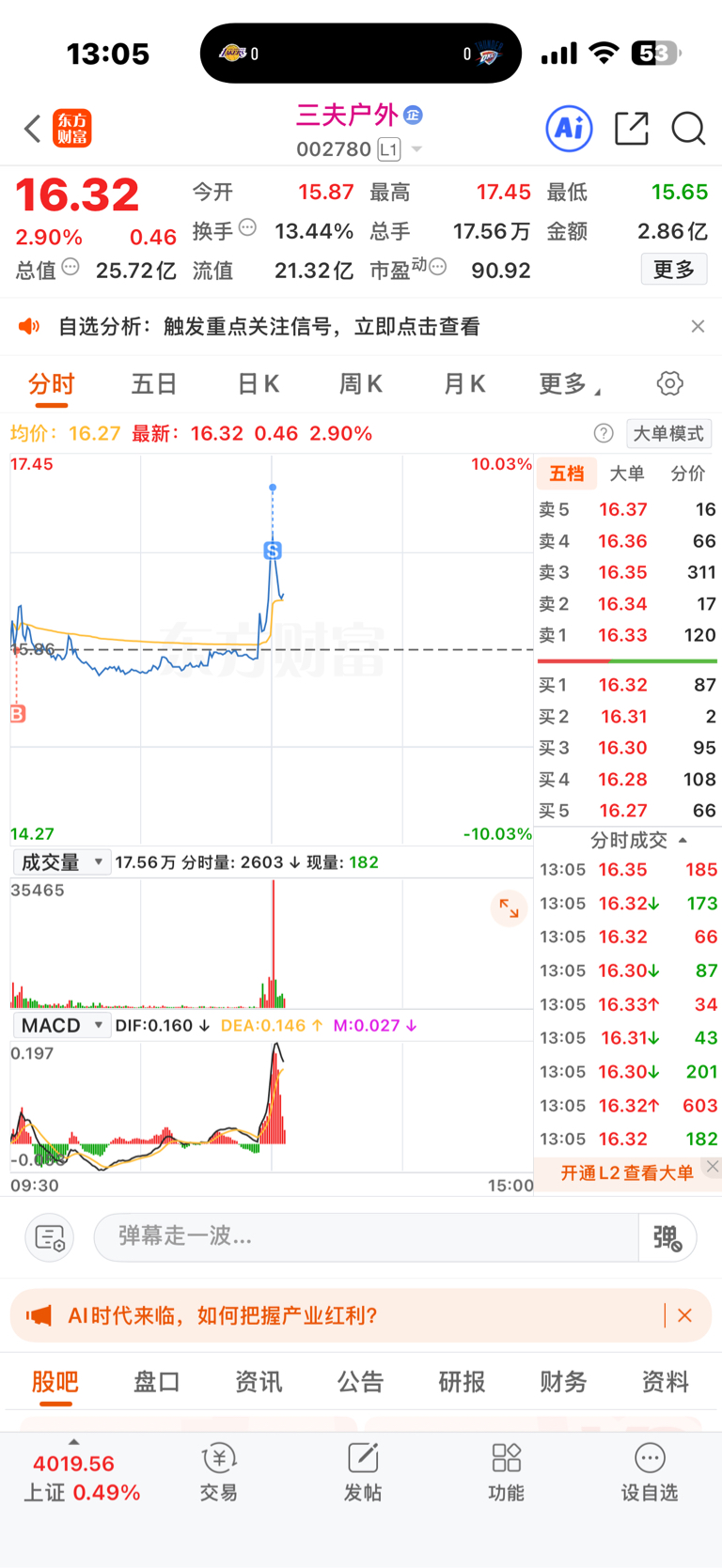$三夫户外(SZ002780)$ 嘿嘿。挂个委托,卖最高点。