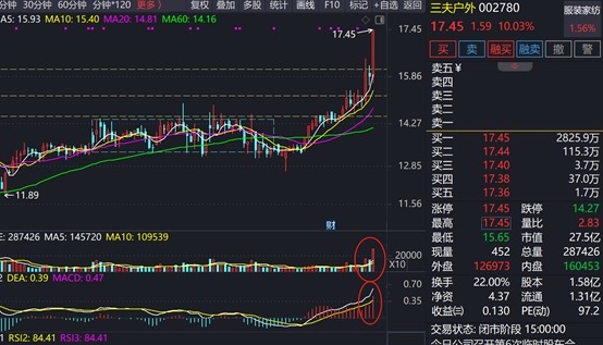 三夫户外近期呈现明显上涨趋势,价格由13.32元稳步攀升至17.45元,尤其近三