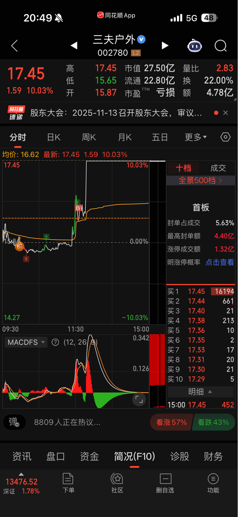 $三夫户外(SZ002780)$ 早盘收尾看到异动,下午第一个盘中比较深的回调均线下手3000股,明天涨了就跑