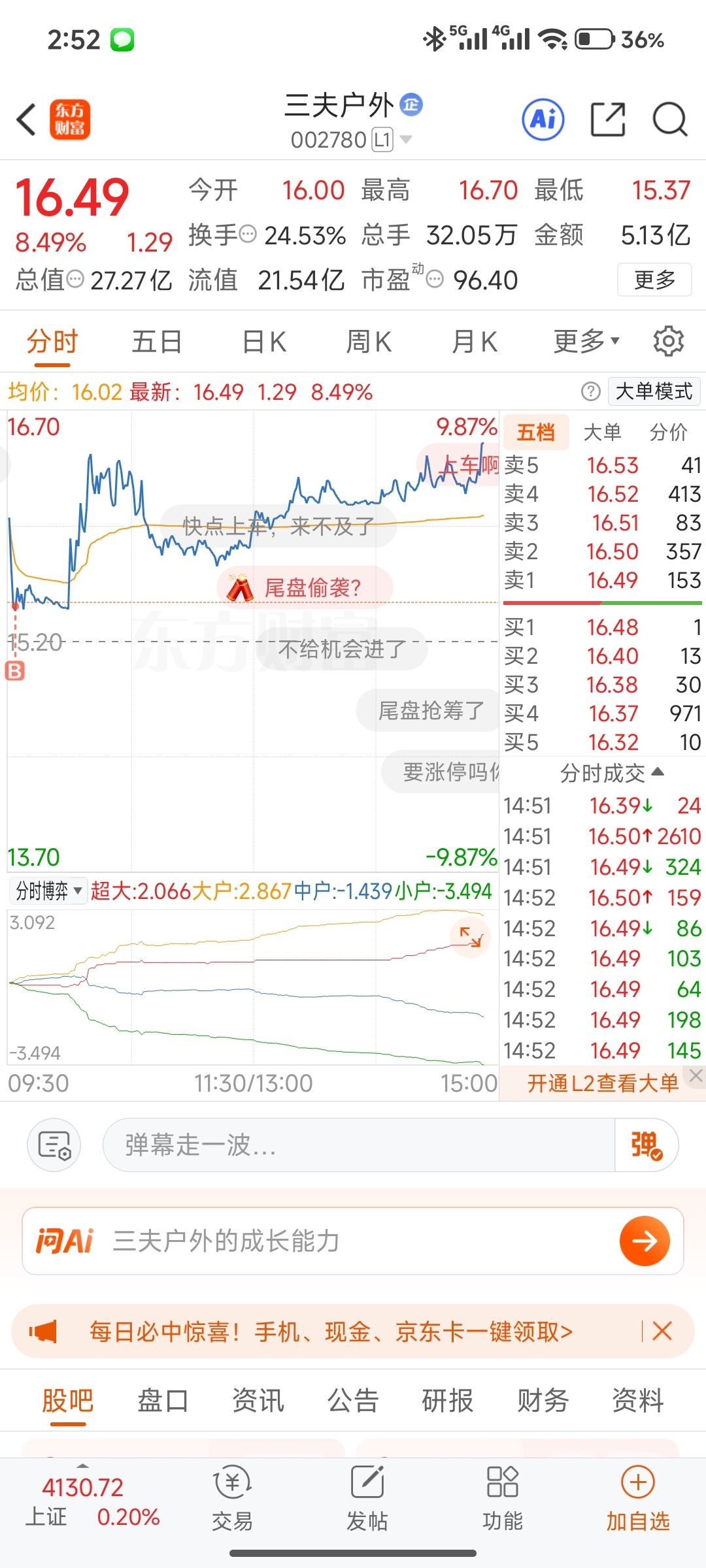 $三夫户外(SZ002780)$ 今天真的是吃爽了,可惜胆子小,只买了200股