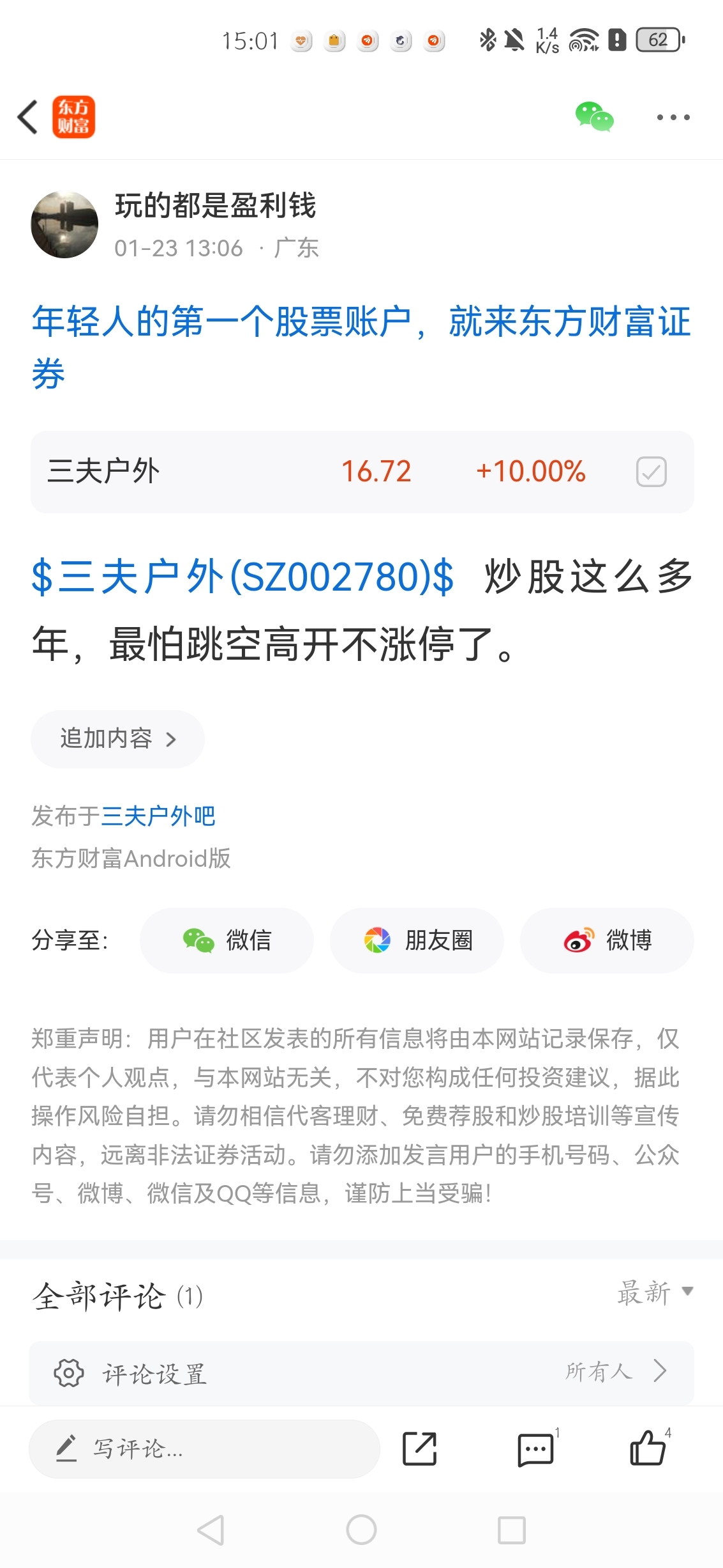 温馨提示: 1.根据《证券法》规定,禁止编造、传播虚假信息或者误导性信息,扰乱证券市场;2.用户在本社区发表的所有资料、言论等仅代表个人观点,与本网站立场无关,不对您构成任何投资建议。用户应基于自己的独立判断,自行决定证券投资并承担相应风险。《东方财富社区管理规定》