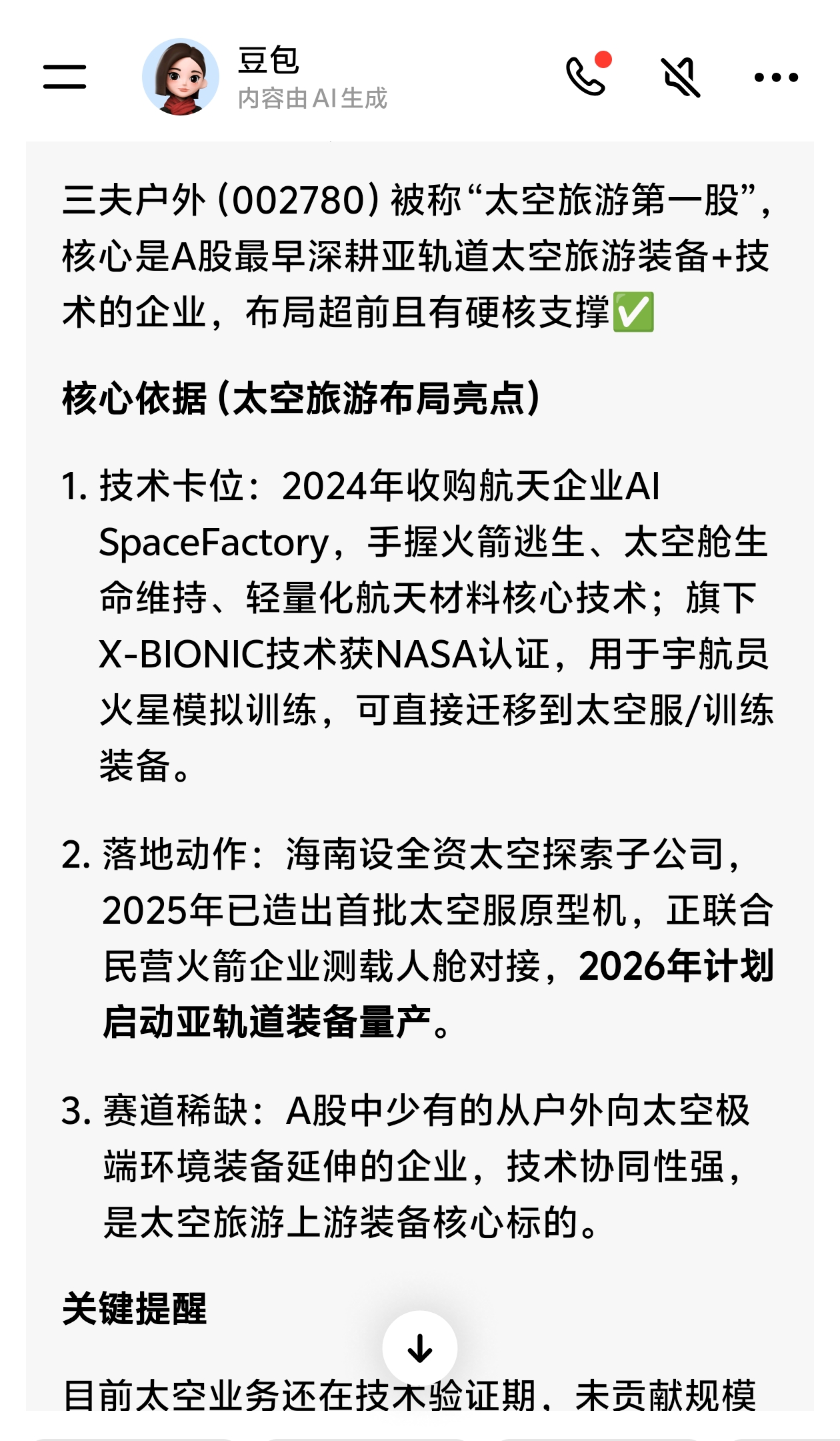 $三夫户外(SZ002780)$ 刚刚一个股友回复说三夫是太空旅游第一股,我搜了下,还真是