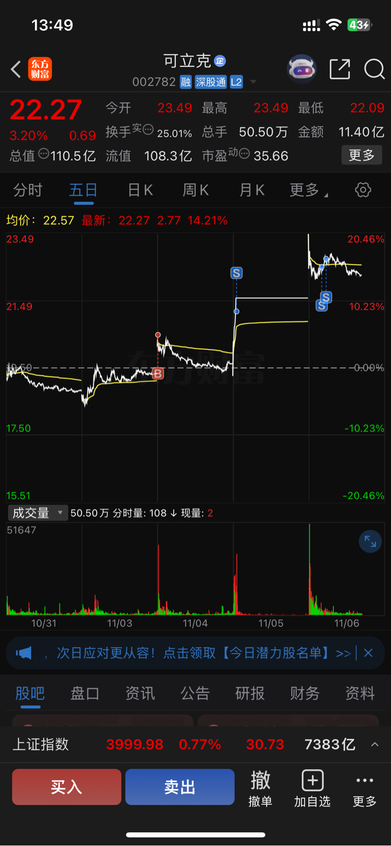 $可立克(SZ002782)$ 昨天减半今天清完,感谢