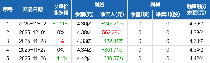 融资方面,当日融资买入639.89万元,融资偿还886.09万元,融资净偿还246.21万元。融券方面,融券卖出0股,融券偿还0股,融券余量0股,融券余额0元。融资融券余额合计4.36亿元。
