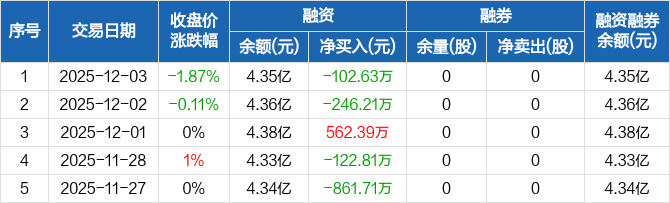 凯龙股份融资融券信息显示,2025年12月3日融资净偿还102.63万元;融资余额4.35亿元,较前一日下降0.24%。