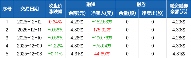 凯龙股份:融资净偿还152.63万元,融资余额4.29亿元(12-12)