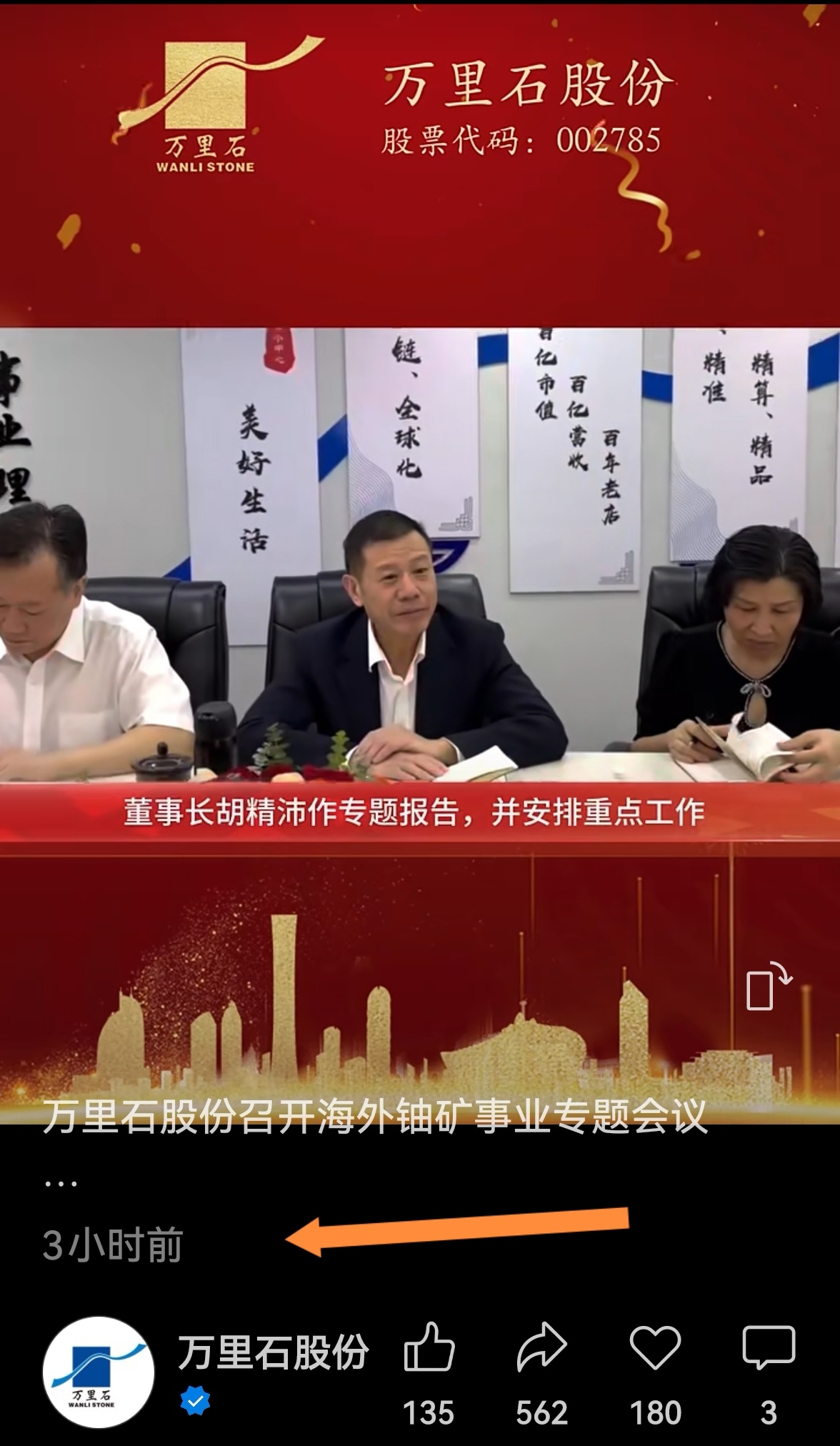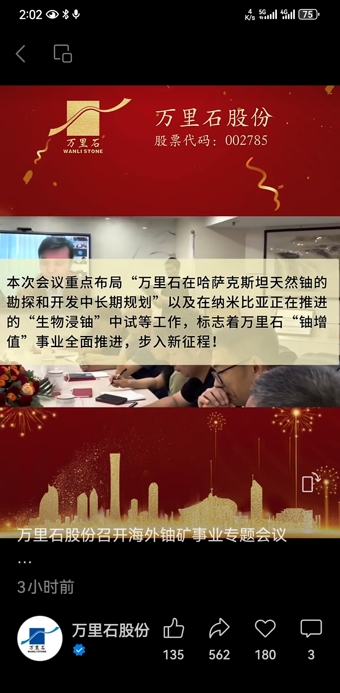 本次会议重点布局"万里石在哈萨克斯坦天然铀的勘探和开发中长期规划"以及在纳米比亚正在推进的"生物浸铀"中试等工作,标志着万里石"铀增值"事业全面推进,步入新征程!