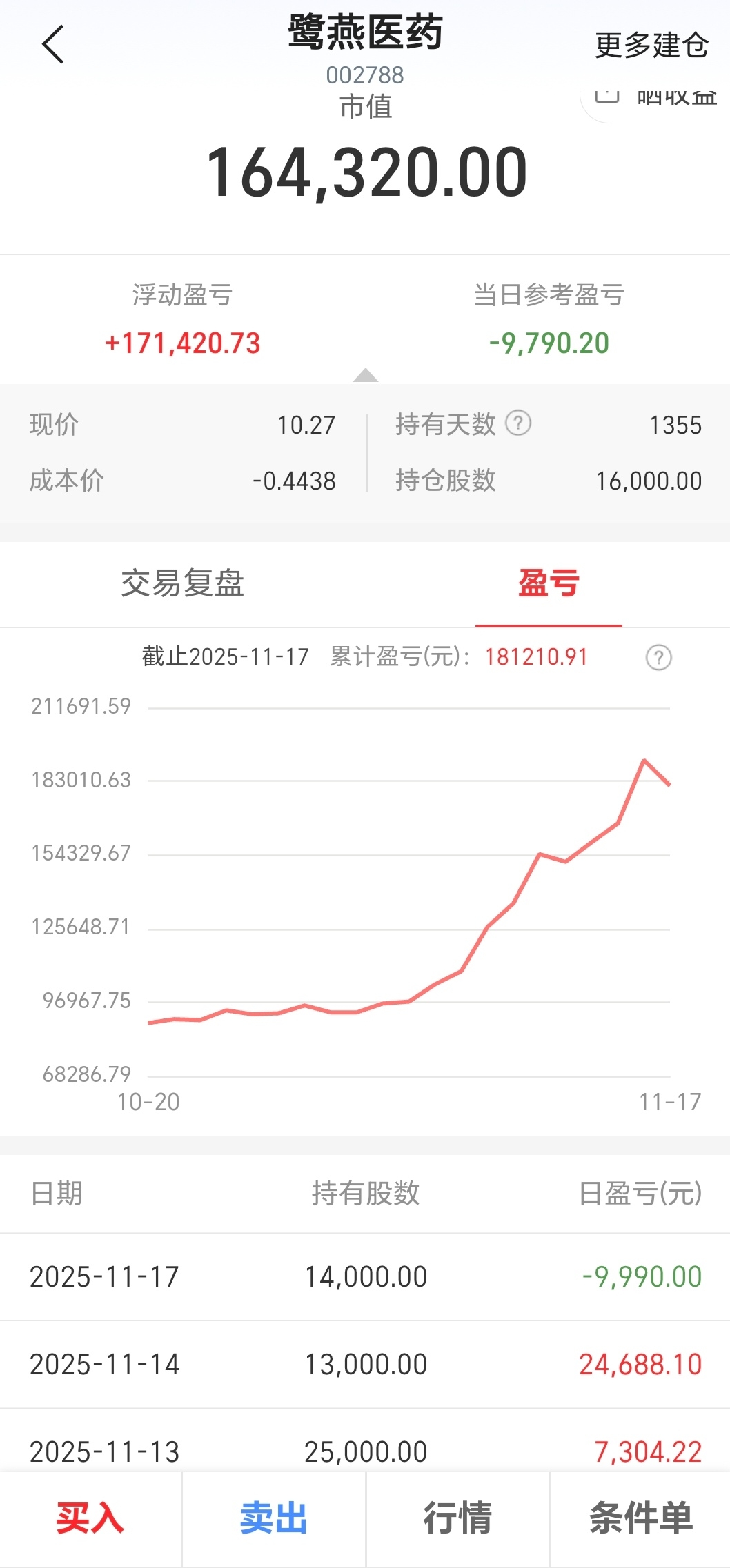$鹭燕医药(SZ002788)$ 开盘接回1000股,设置10.25成交了又接回1000股,持仓16000股。大概率要调整挺久,这是鹭燕的股性。再等9块多考虑补仓,过程中不用理会。#炒股日记#