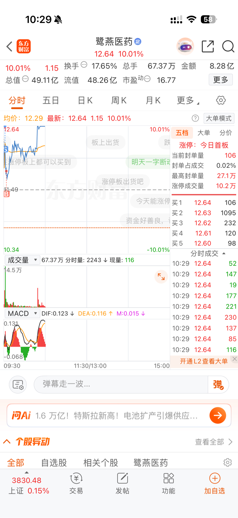 $鹭燕医药(SZ002788)$ 今天分歧转一致,砸下来承接也强,就是封板让人有点担心,不过明天问题不大,有机会走。还是看多,不过短线,只有弱不弱强不强,没有洗盘没有拉高。