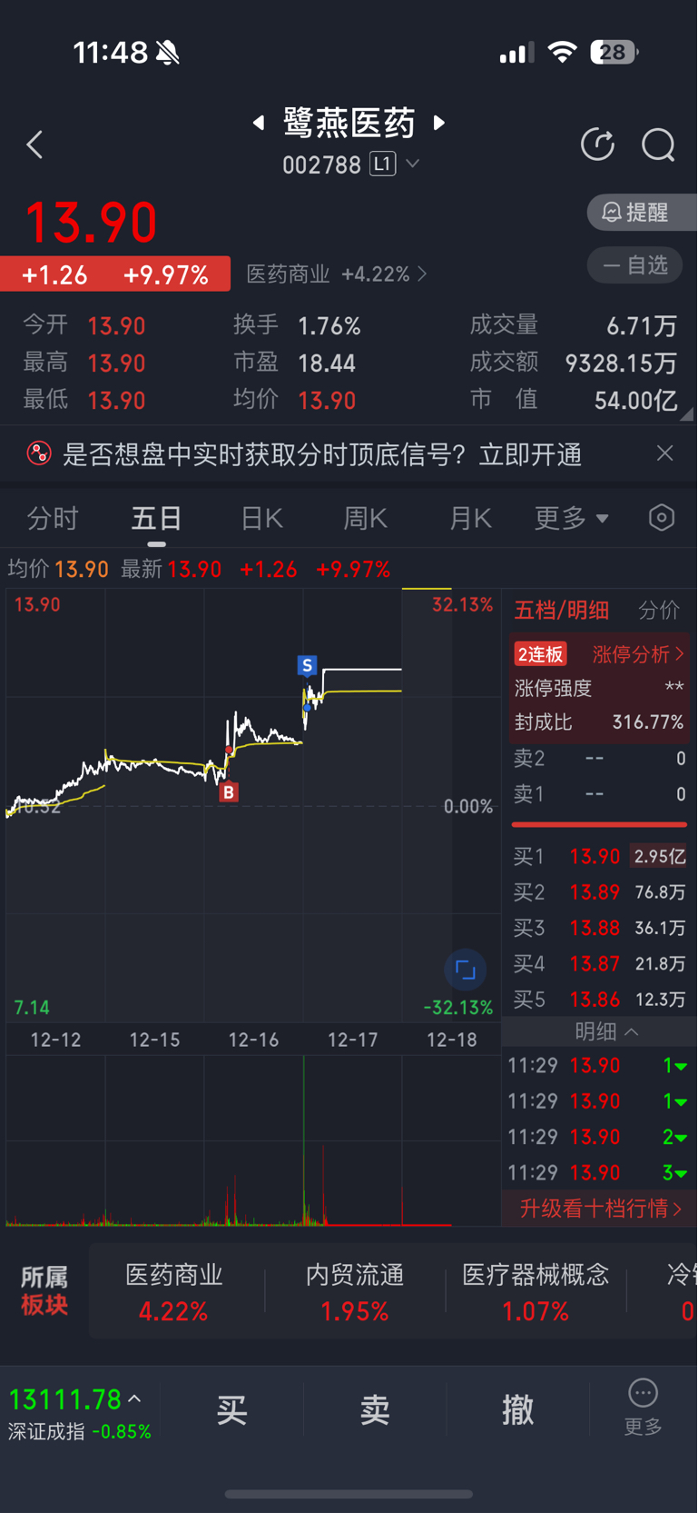 $鹭燕医药(SZ002788)$ 下午开板吧,不然难受死