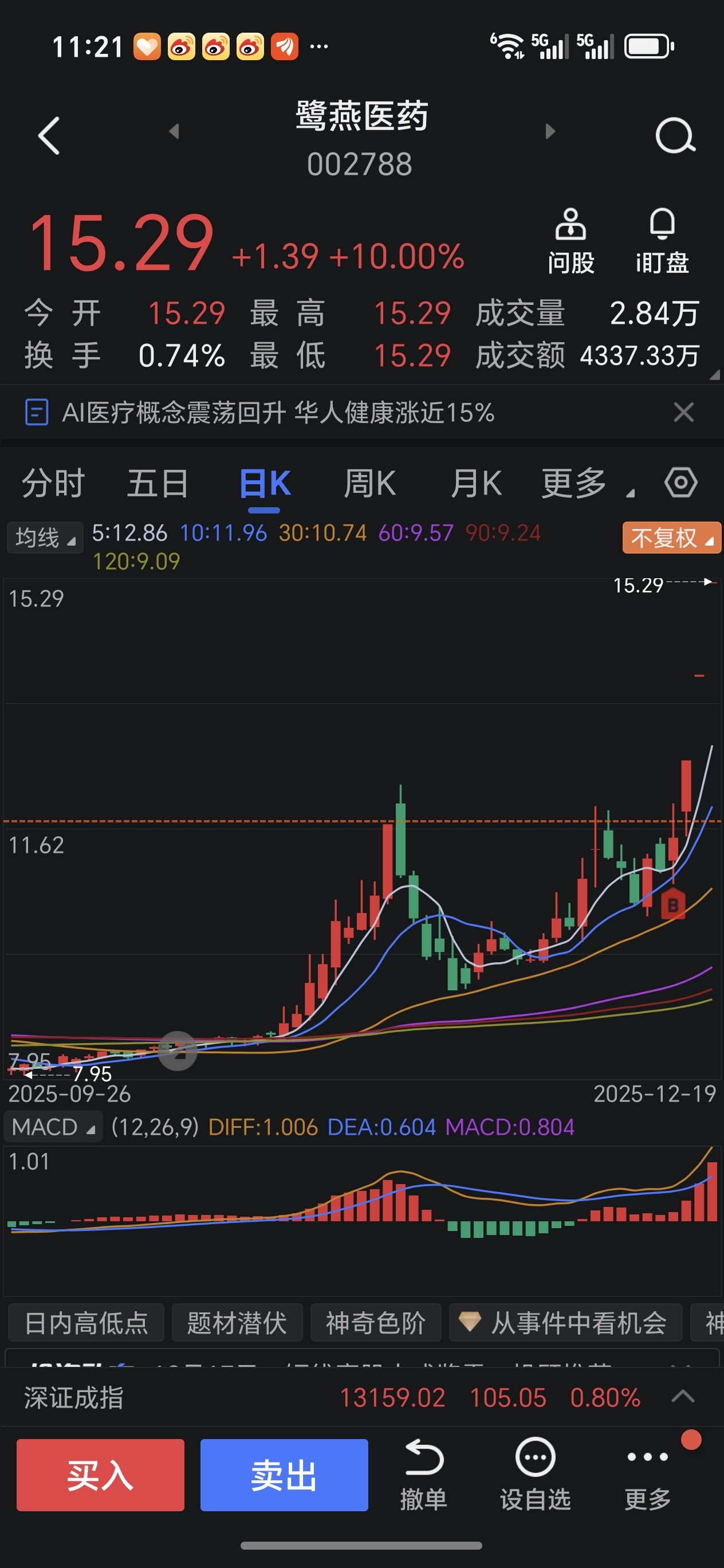 $鹭燕医药(SZ002788)$ 底部盘整多年,周二 3成仓打入,放量突破压力位,股价起飞。