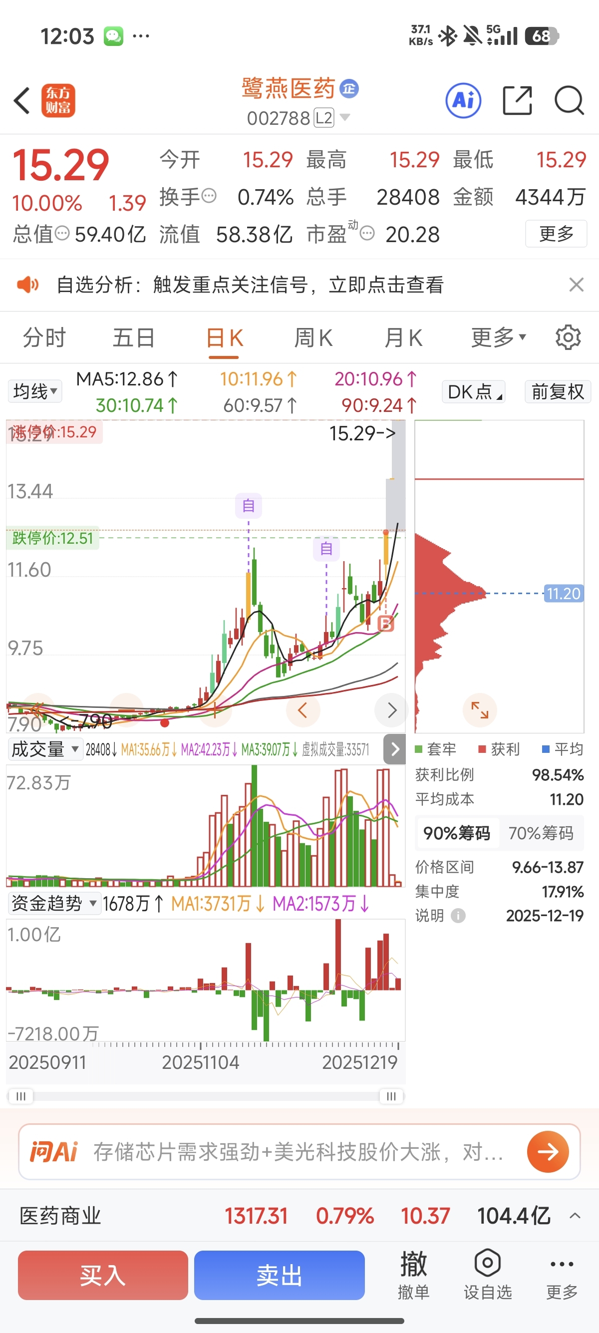 $鹭燕医药(SZ002788)$ 封单强势,换手低迷,但板块中的小弟在地上趴着,不是龙头吧3连板,是龙头吧带不动板块小弟,这次把韭菜我整不会了