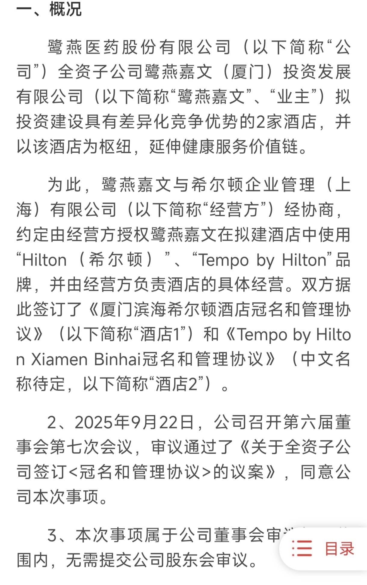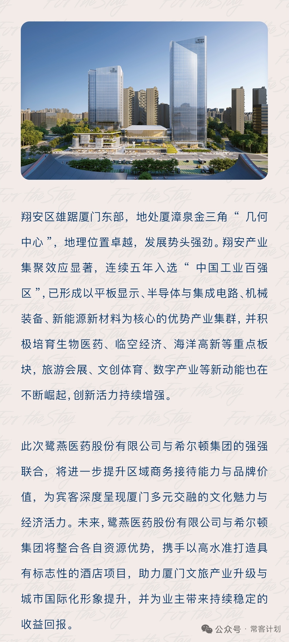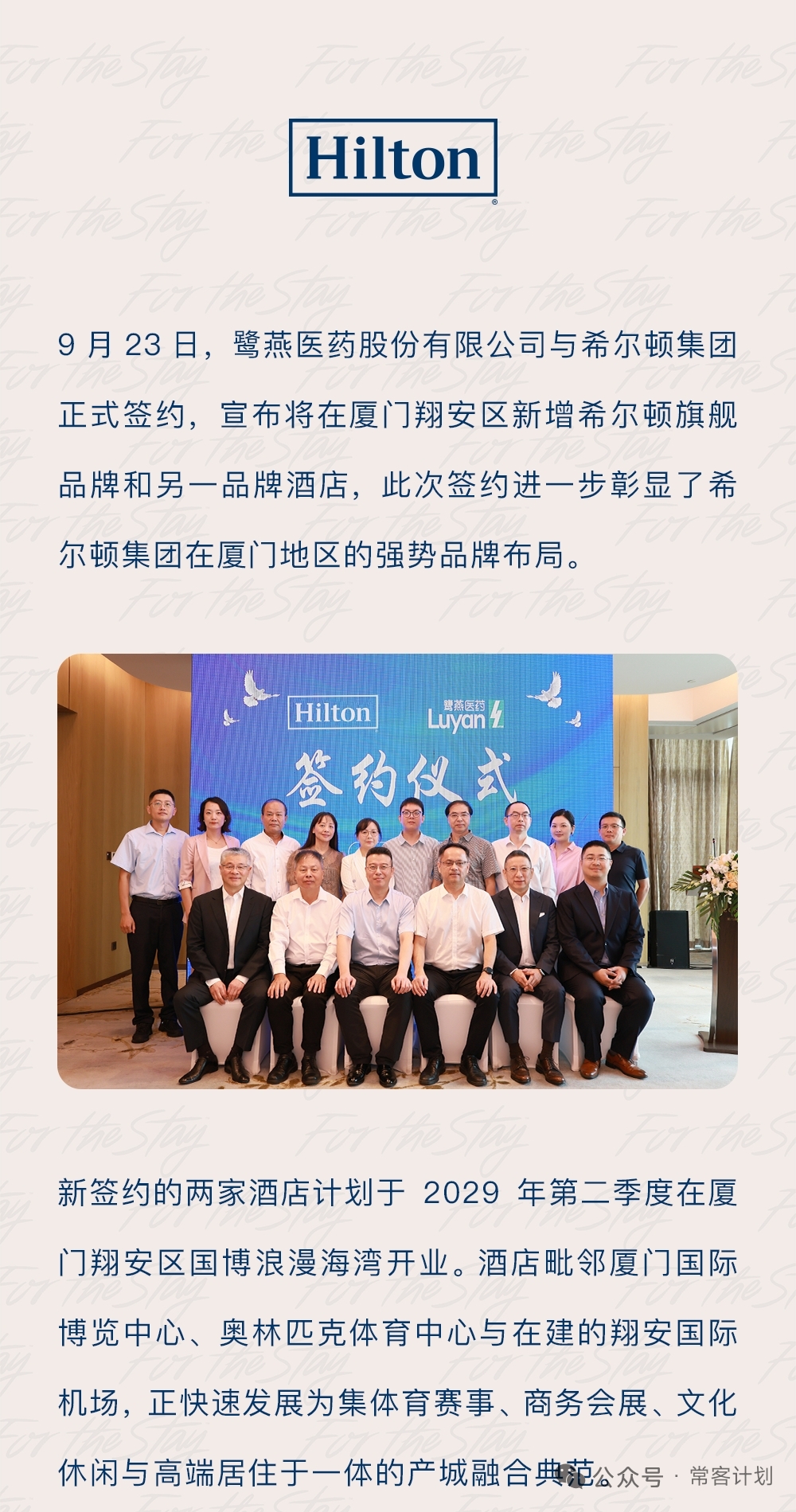 鹭燕医药【旅游+酒店+养老】鹭燕医药与希尔顿集团于厦门正式签约,将在翔安区国博浪漫海湾新建两家酒店,分别为希尔顿旗舰品牌及另一品牌,计划2029年第二季度开业。