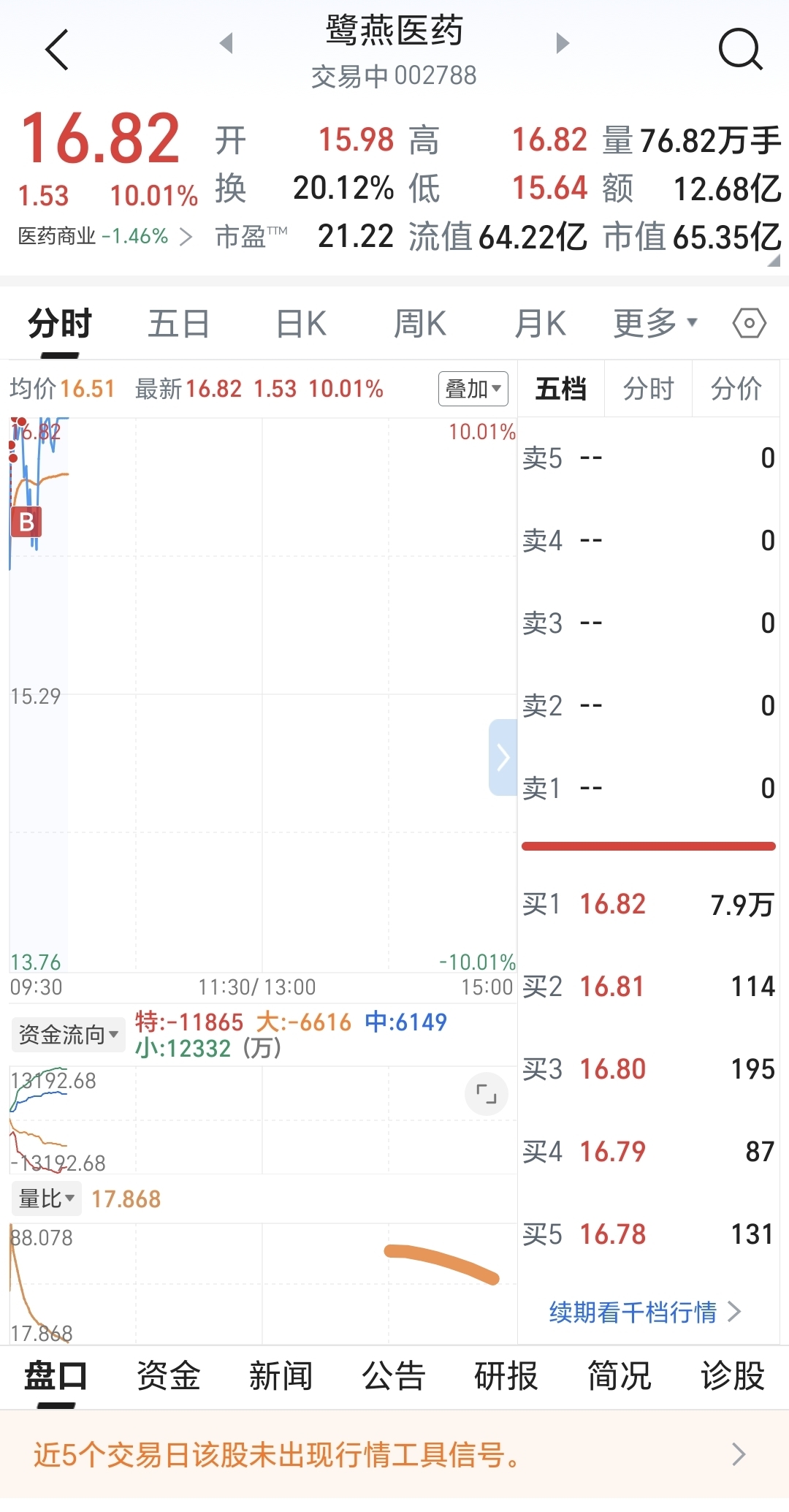 $鹭燕医药(SZ002788)$ 打板加仓,只买不卖了!
