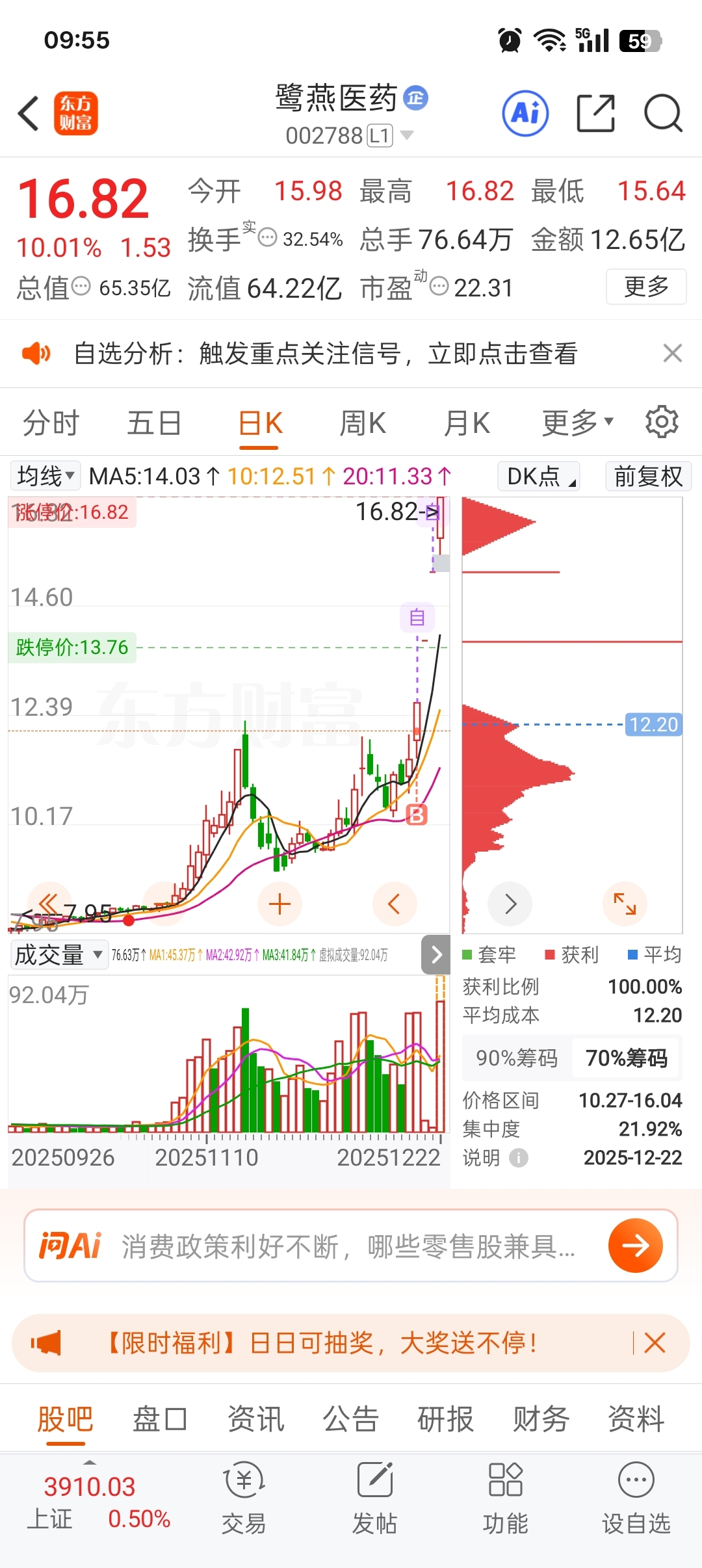 $鹭燕医药(SZ002788)$ 洗干净了,又是数板,全仓持仓一股没动,几次那么好的机会我甚至没敢做t,就是怕一不小心给甩下车。今天机会给足了,不过不敢买的给再多机会也还是不敢买,只会眼红唱空。