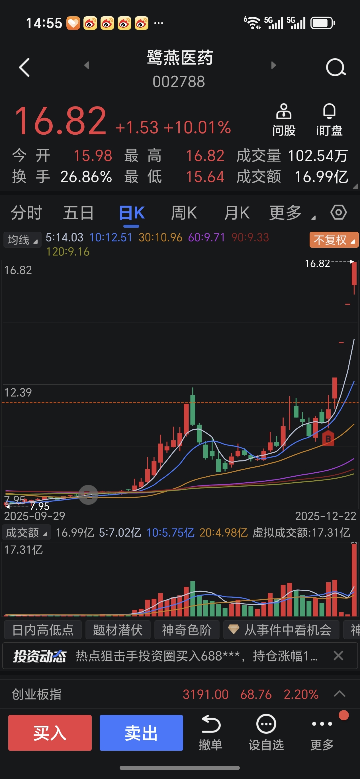 $鹭燕医药(SZ002788)$ 爆量换手,分歧转一致,再高看一眼。封的住板留,封不住撤。