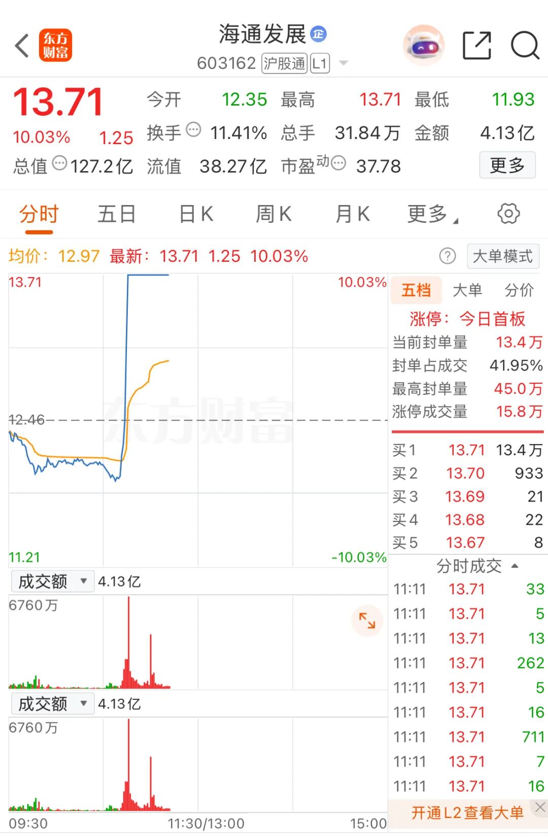 早盘,福建板块盘中回暖,鹭燕医药触及涨停,海通发展、浔兴股份直线涨停,此前安记食品、安通控股、合兴包装涨停。平潭发展股价直线冲高,一度涨近6%,截至发稿仍涨近4%。漳州发展、厦门港务等冲高。